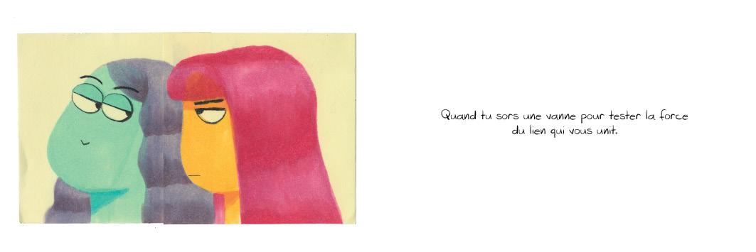 Mimiques, postures : son trait d’une rondeur sensuelle, volontairement outré, cartoonesque, saisit à la perfection toute la palette du langage corporel, alors que les punchlines mises en regard de chaque dessin viennent accentuer le comique des images. Chaque légende commence d’ailleurs le plus souvent par « Quand… », ce qui fait de Miranda Tacchia la petite cousine américaine arty d’Éléonore Zuber et de sa série à succès des Lorsque… (90 000 ex. vendus tous titres confondus) – avec un objet d’une tout autre catégorie cependant –le livre est cartonné, en quadrichromie, dans un format à l’italienne.