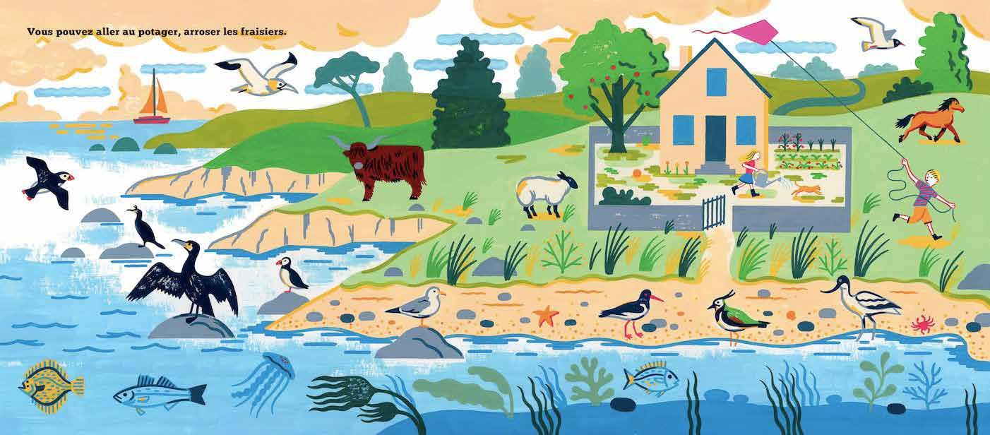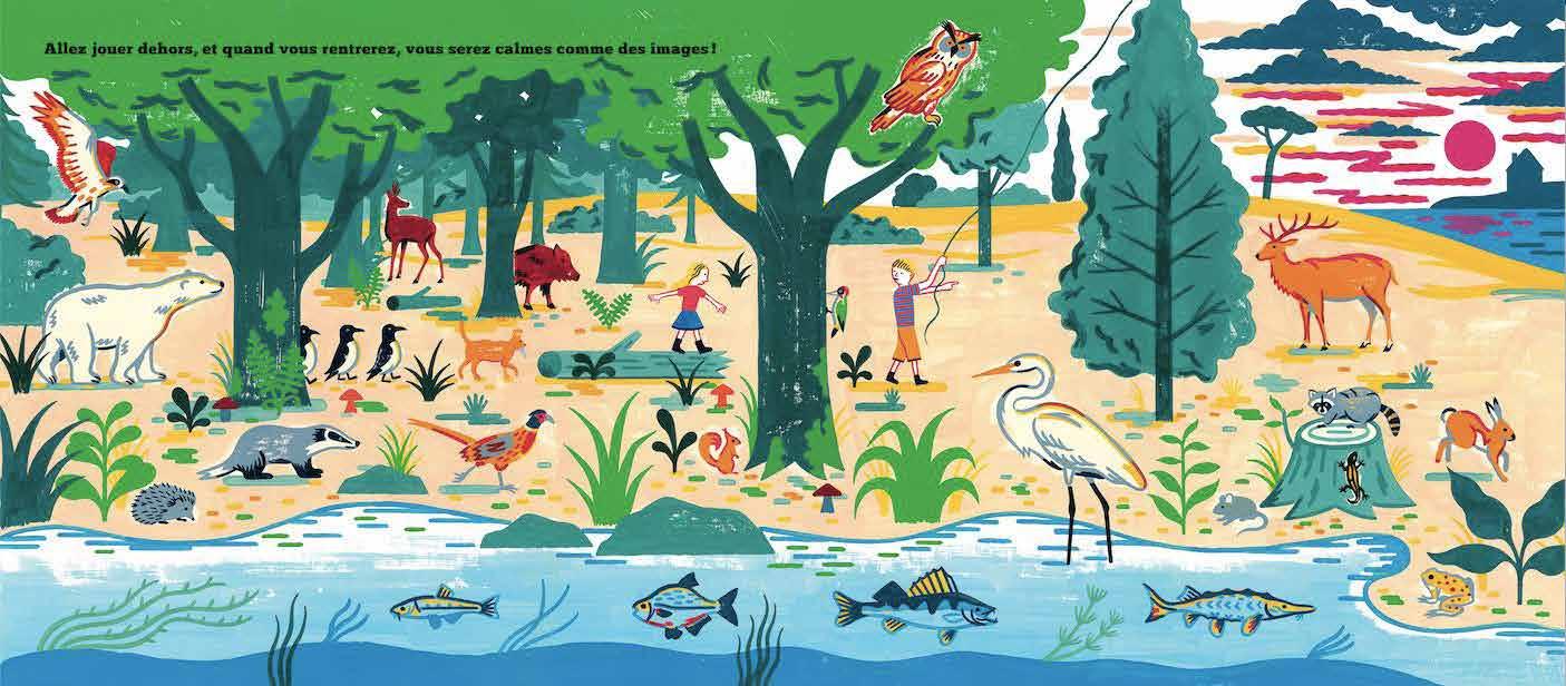 • Une esthétique très forte où toutes les illustrations obéissent à un même cadre, montrant les scènes vues du ciel. Une mise en page originale qui permet de prendre du recul et d’observer les choses calmement tout en se questionnant.