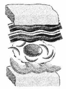 Puis, dans le dédale des boyaux où la reptation est souvent obligatoire, se déroule un formidable « scénario de la vie » qui prend naissance dans les profondeurs et s’élance vers la sortie de la cavité, cent cinquante mètres plus loin. Le panneau que j’ai baptisé « panneau des monstres » comporte une douzaine de gravures placées sur une voûte basse de la galerie de sorte que les créatures dessinées, entièrement imaginaires et composites, semblent surgir d’une bouche d’ombre : certaines de ces créatures de 30 à 50 cm de longueur évoquent un cheval mais le nez est trop volumineux, une autre montre un cou exagérément allongé ressemblant à un serpent ou une anguille, il ondule sur les replis de la roche pour hisser sa tête dans la lumière de la galerie et sa tête est bien alors celle d’un cheval qui paraît tout éberlué de sa propre apparition… Une autre tête animale surmontée d’une sorte de ramure est pourvue d’un bec, un héron stylisé apparaît à côté d’un animal réduit à un bec proéminent et possédant deux oreilles et deux pattes… Plusieurs muffles de monstres sont indéterminables ; ce qui ressemble à un cheval présente également le cou et la tête des biches et enfin une petite gravure d’un cervidé d’une trentaine de centimètres a suscité mon émerveillement lorsque je l’ai re-