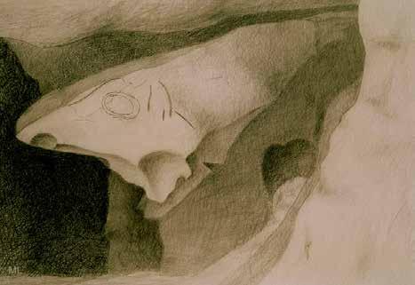 Ici, au fond de Pergouset, tout près de l’eau souterraine, une strate du calcaire de la paroi mise en relief par l’érosion a été transformée par quelques tracés gravés en un gigantesque poisson de 2,70 m de longueur évoquant un squale ou plutôt les grands esturgeons qui remontaient le Lot pendant l’époque glaciaire… Ce poisson de Pergouset invoque l’eau, source de toutes vies, il appelle le retour saisonnier des grands migrateurs, saumons et esturgeons, et sans doute aussi la naissance de la vie dans le sein de la terre. Dans plusieurs grottes ornées l’eau souterraine semble avoir joué le rôle du sang ou du liquide amniotique de la Terre Mère universelle… à Pech Merle par exemple, une cascade tombant de la voûte baigne et anime une scène de peintures montrant des divinités féminines s’accouplant avec des mammouths !