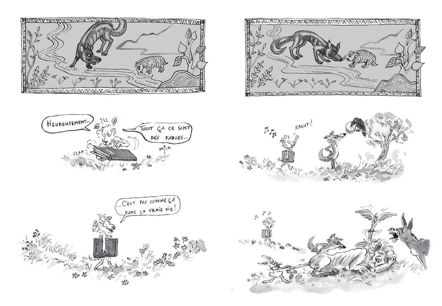 Irène Bonacina, l’autrice des planches qui précèdent les Fables, est née à Paris en 1984. Formée à l’école Estienne, à l’école supérieure des arts décoratifs de Strasbourg et aux Beaux-Arts de Bratislava (Slovaquie), elle a illustré une vingtaine d’albums et romans pour la jeunesse, dont un livre de Françoise Morvan, Les Joies du logis, publié aux éditions MeMo (2013).