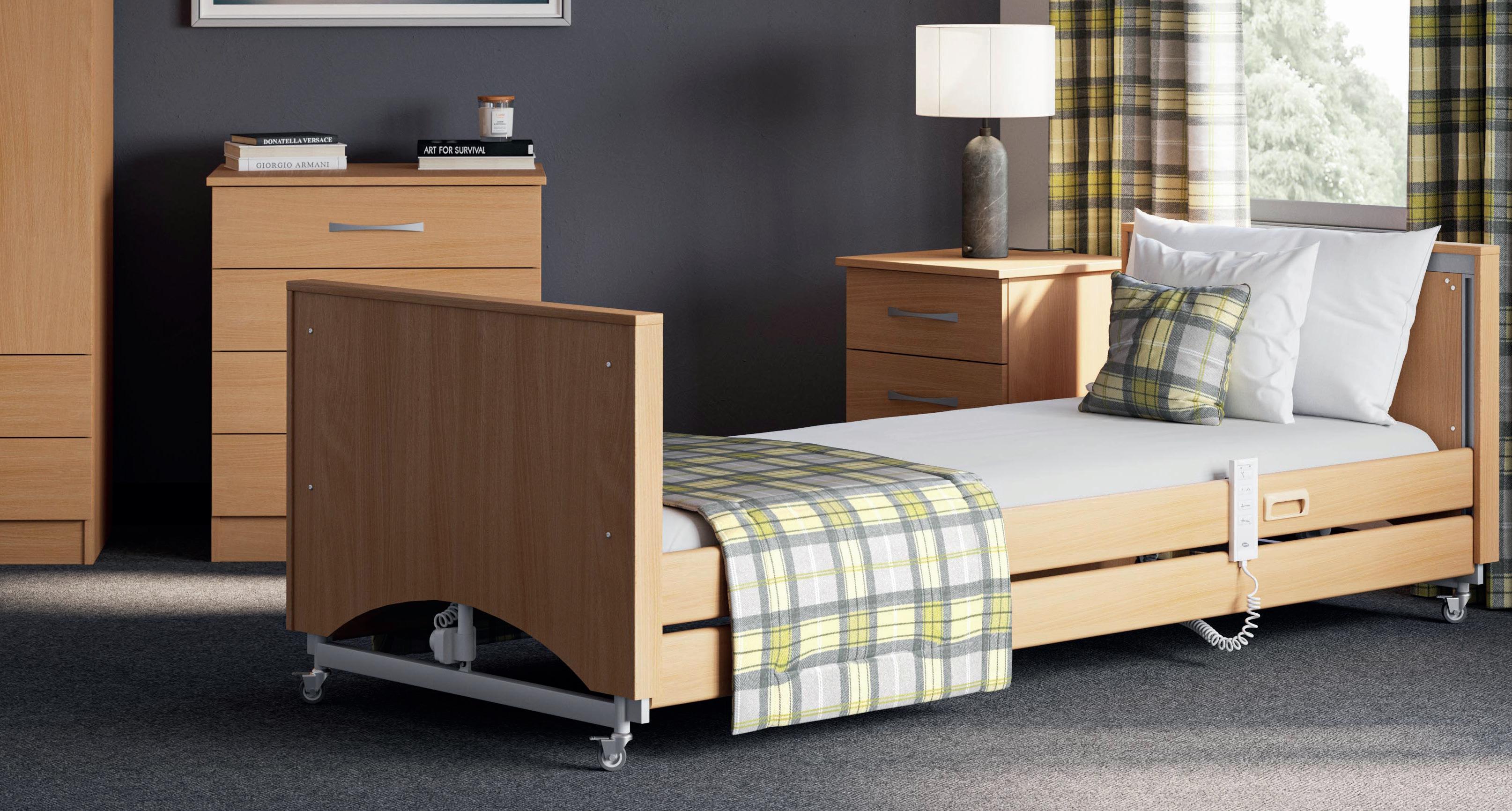 The Medley Ergo range offers practical, comfortable profiling beds designed for care homes. Each model features a four-section mattress support, adjustable height options, and optimised platform sections to reduce shear and friction. Easy to transport and assemble without tools, all beds come in a warm Beech finish with a light grey frame, and use reliable Linak motors. Complies with IEC 60601-2-52 and includes a 3-year warranty.