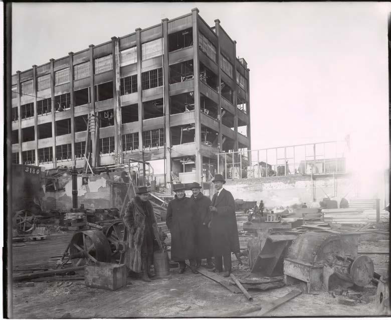 Charles Edison, Thomas Edison, C. H. Wilson e um homem não identificado, diante dos escombros deixados pelo incêndio de 1914. Ao fundo, o Edifício 24.