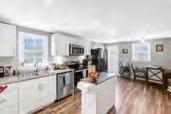 Thoughtfully updated with LVP flooring, replacement windows, new decks, & a beautifully renovated kitchen. The kitchen shines with quartz countertops and soft-close cabinetry. Unwind on the deck. There’s an outbuilding & a Lean-to to park your golf cart. Paved drive. A short stroll to the water, where your PRIVATE DOCK awaits. Affordably priced. $385,000
