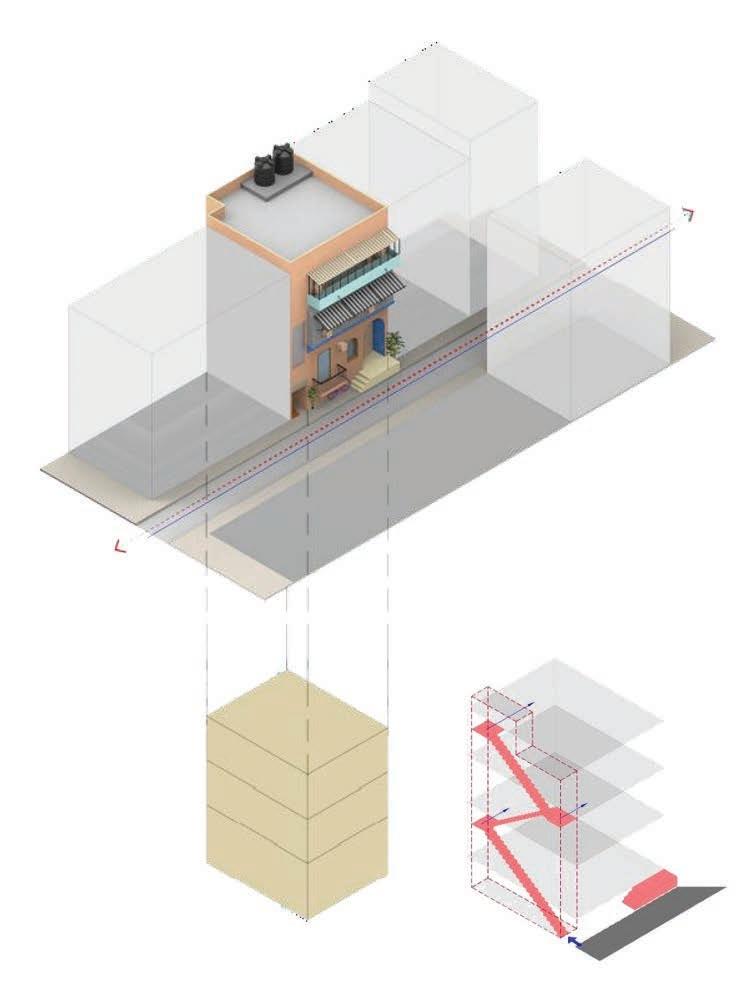 The balconies and jharokha are means of interacting with the activities on the street. The use of Jali (perforated cladding) on staircase core allows for light inside. The street facing shops stimulate public