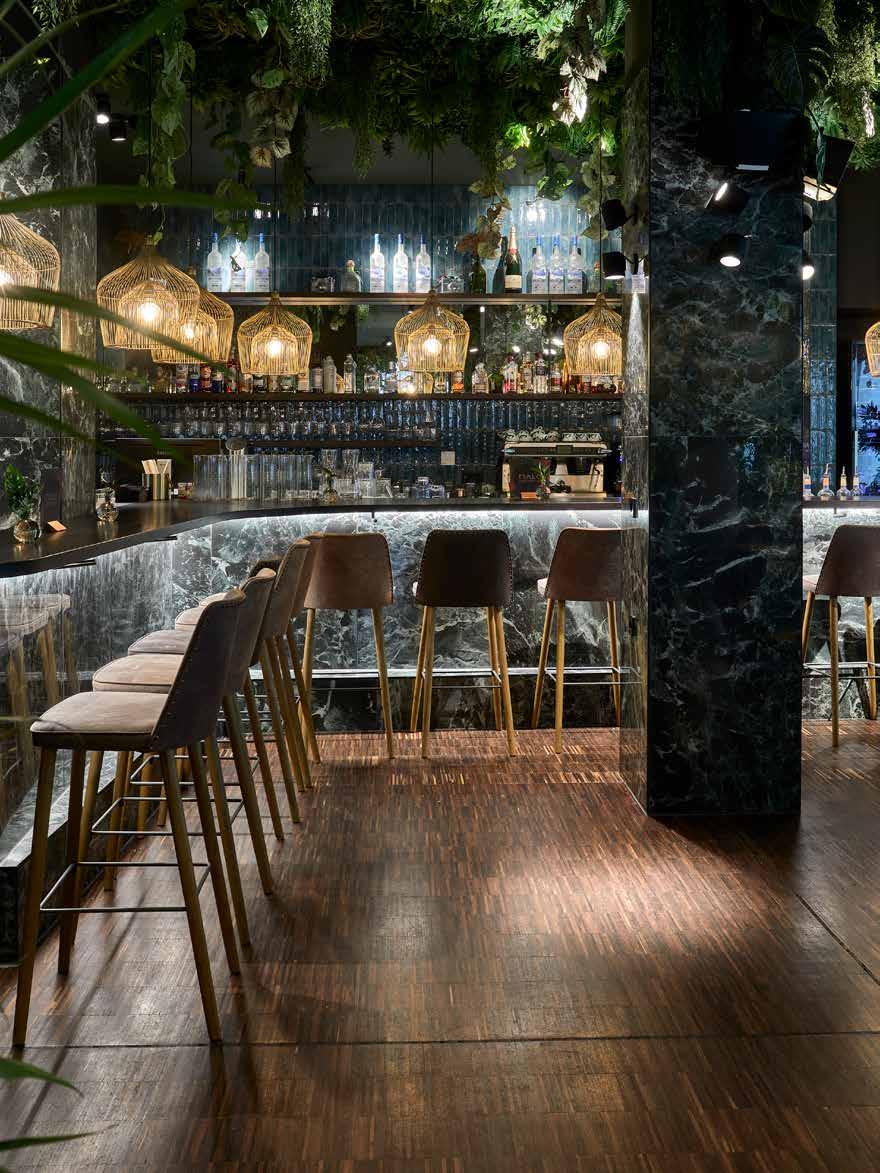 maßgeschneiderten Murals bringen das Außen nach innen, aber auch das Innen nach außen, da es für die Motivwahl oft „nostalgische Gründe“ gäbe. Bäume aus der Kindheit – oder der weit entfernten Heimat. Beispiel: eine österreichische Familie in Asien, für die Hartig jegliche Grenzen mit Farbpigmenten pulverisierte. Da steht die Palme vor dem Hochkönig, die Pagode neben der Kirche. „Durch meine Wandgemälde schaffe ich Porträts von Familien, ohne deren Gesichter zu zeigen“, lächelt Hartig, die als Diplomatentochter österreichischer Eltern weit gereist ist. „Man muss sich überlegen, welche Pflanzen braucht exakt dieses eine Zimmer?“ Genau das ist ein wichtiger Punkt: Floral ist nicht gleich floral, Pflanze nicht gleich Pflanze. Heutzutage geht es um Feinheiten, darum, Persönlichkeit zu zeigen. Und nicht zu jedem Raum oder zu jedem