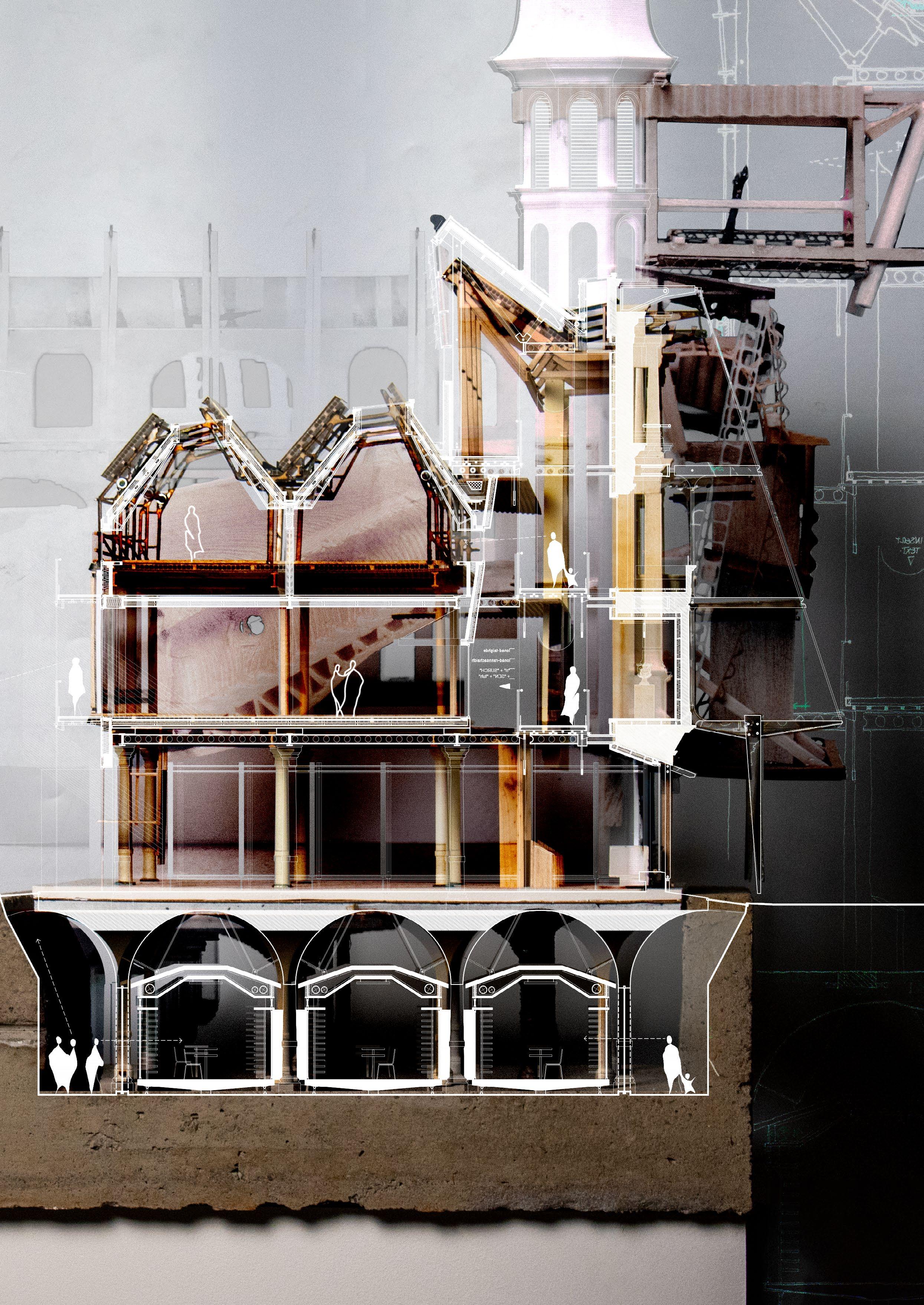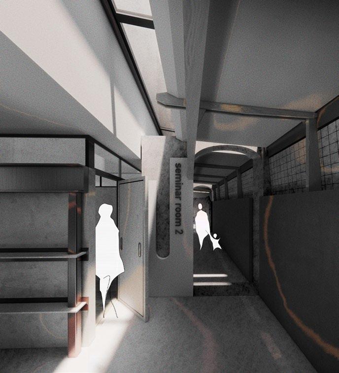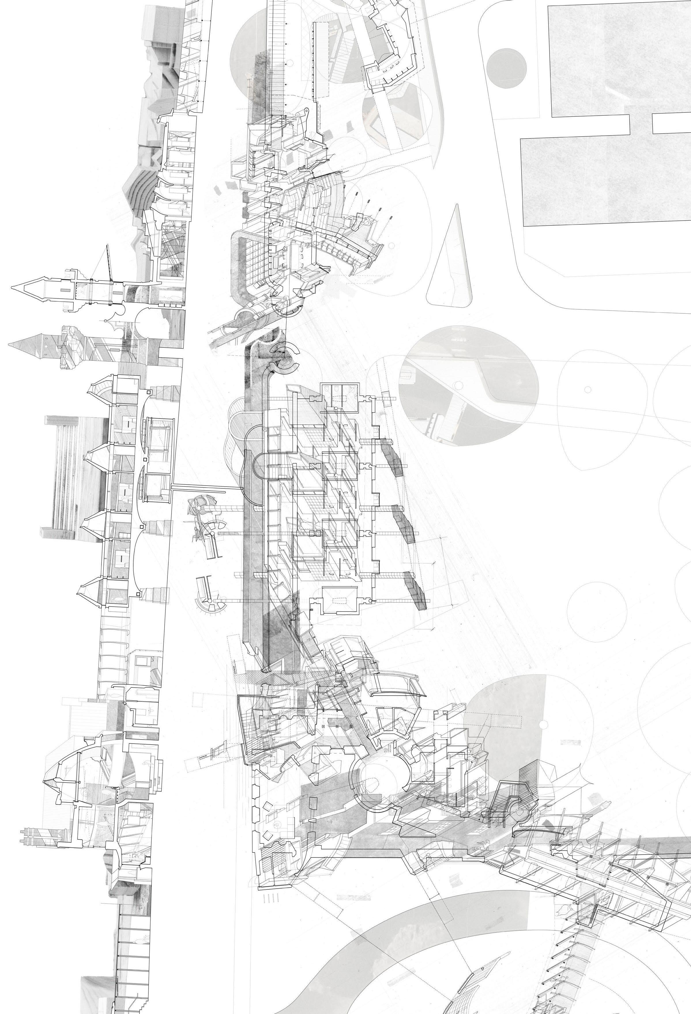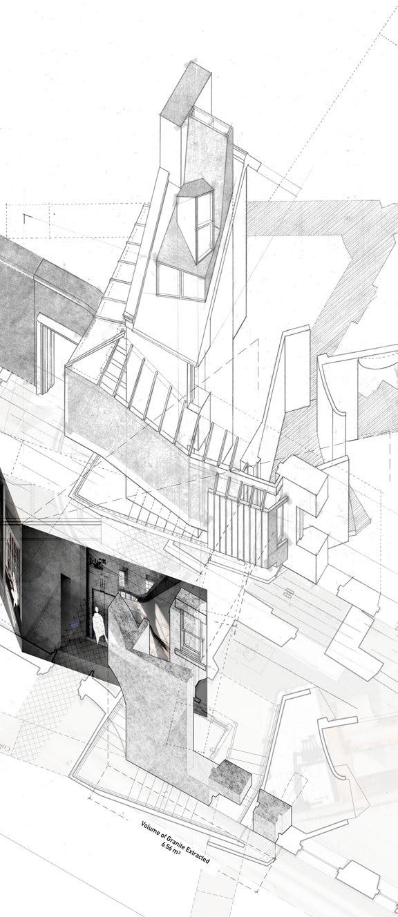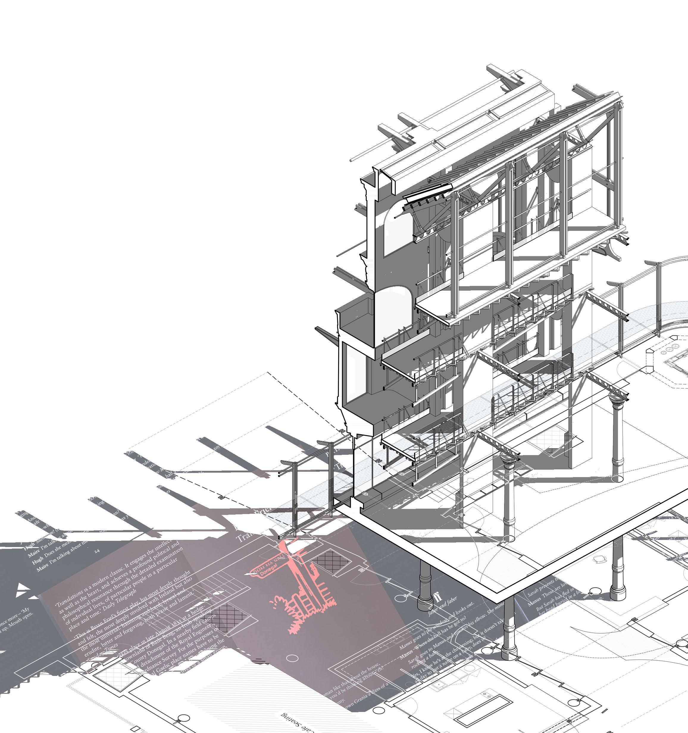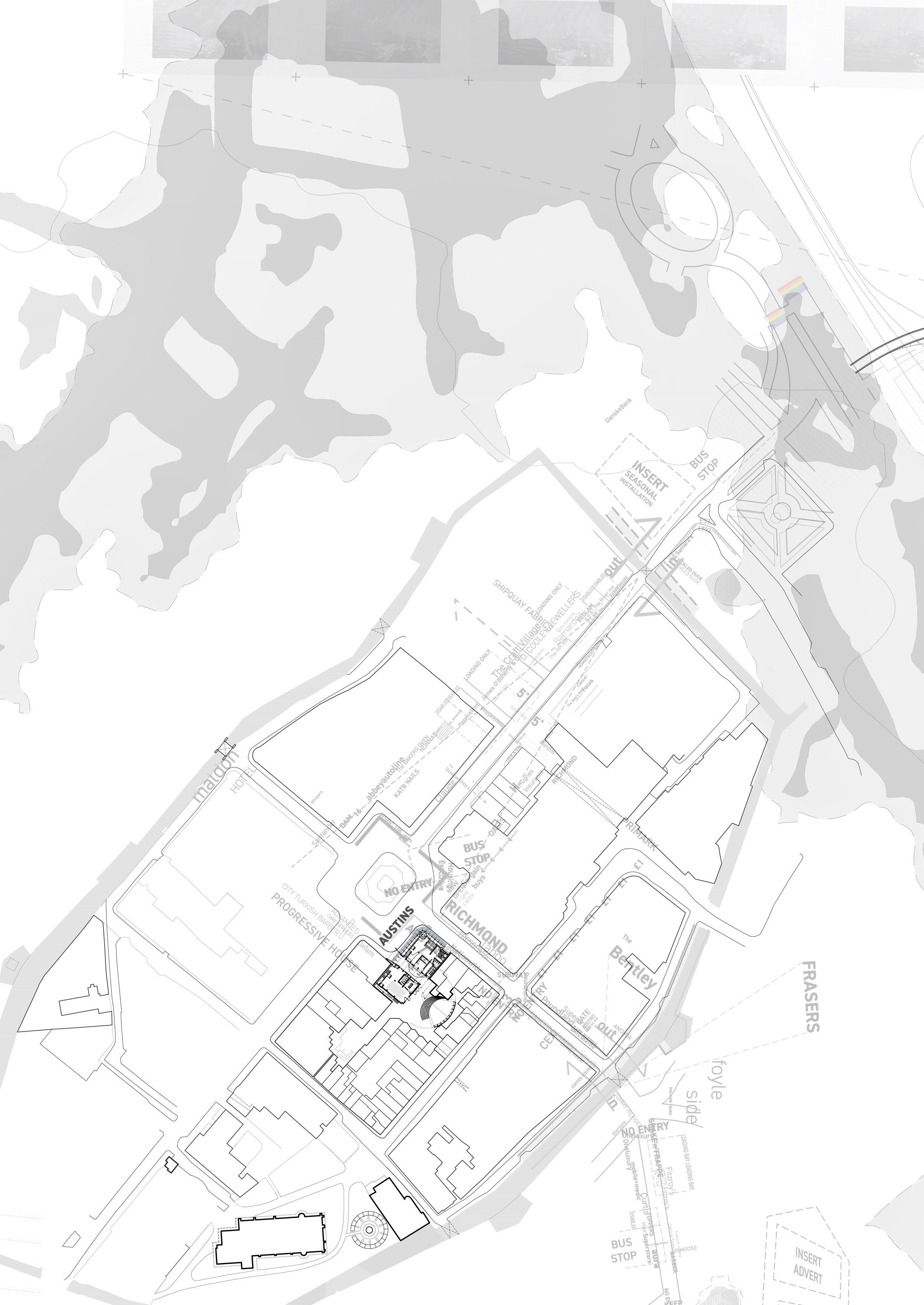 In a previous life this high density, social and economic condenser operated as a highly effective agent in the interested of internal capitalism and consumerism. By re-conditioning Austin’s, addressing its immediate context, in particular ‘The Diamond’, this design thesis aims to translate and re-appropriate an existing colonial, consumerist typology through a set of carefully choreographed design moves. Utilising spatial concepts of ‘Irrational Rhythm’, Indigenous structures and ‘Vernacular Compression & Expansion’. Inspired by Irish Myths, Metaphors and juxtapositions, poetically communicated in the Brian Friel play ‘Translations’. The project predicates itself on re-appropriating the previous socio-economy ecotone that resided within the Centre of Derry, to a new form of 21 century, ‘Irish’ spatial typology centred around language, knowledge exchange and social gathering.