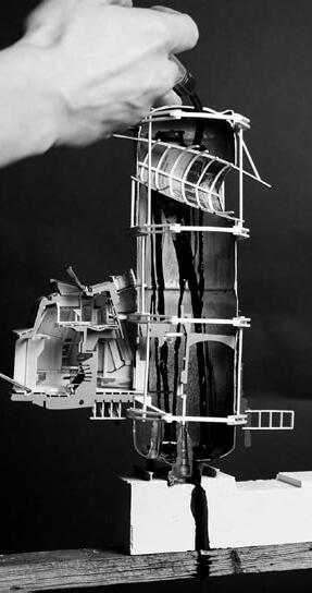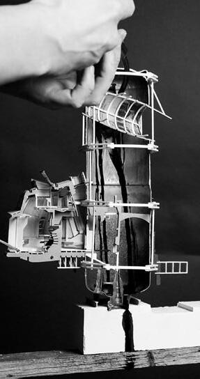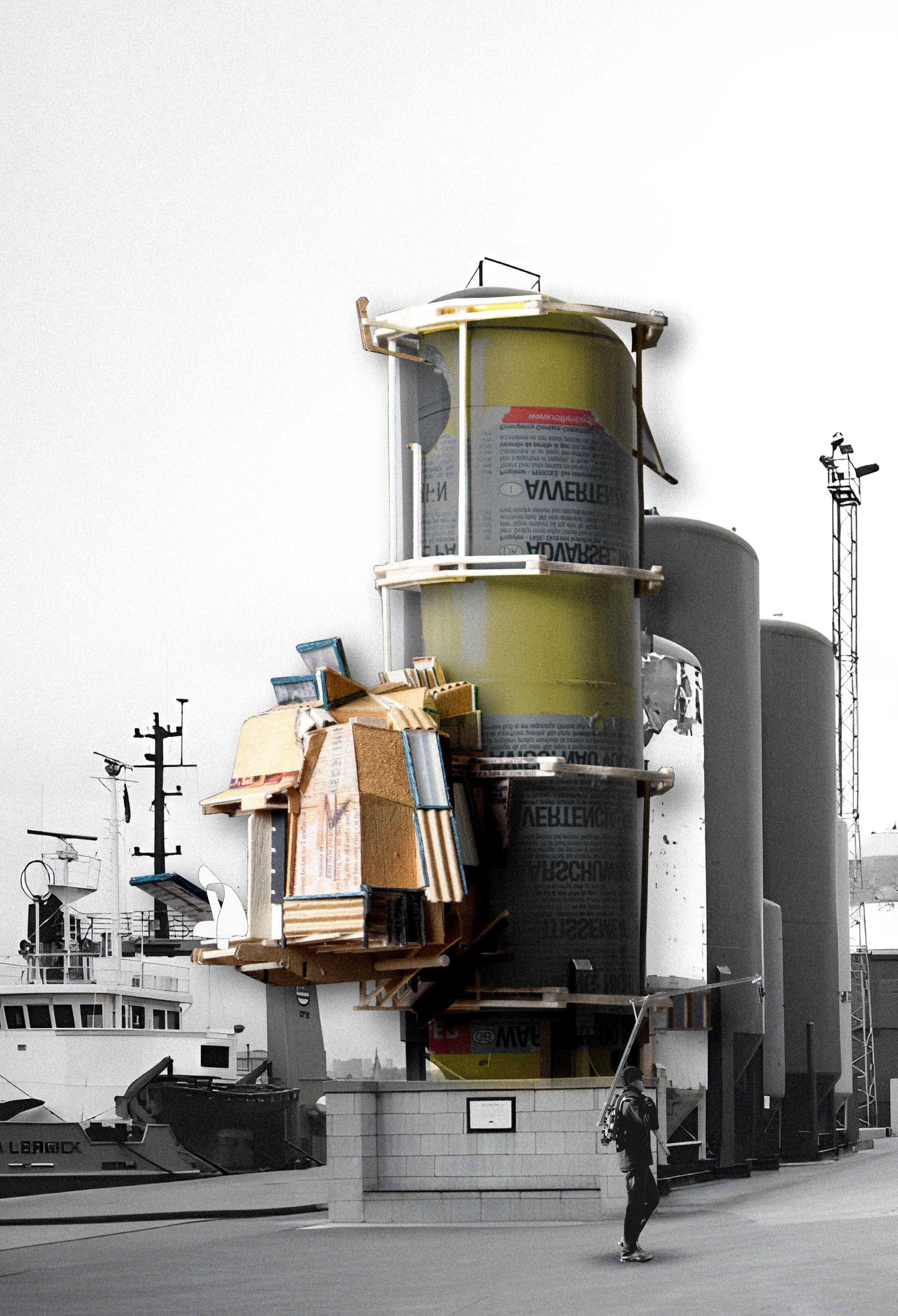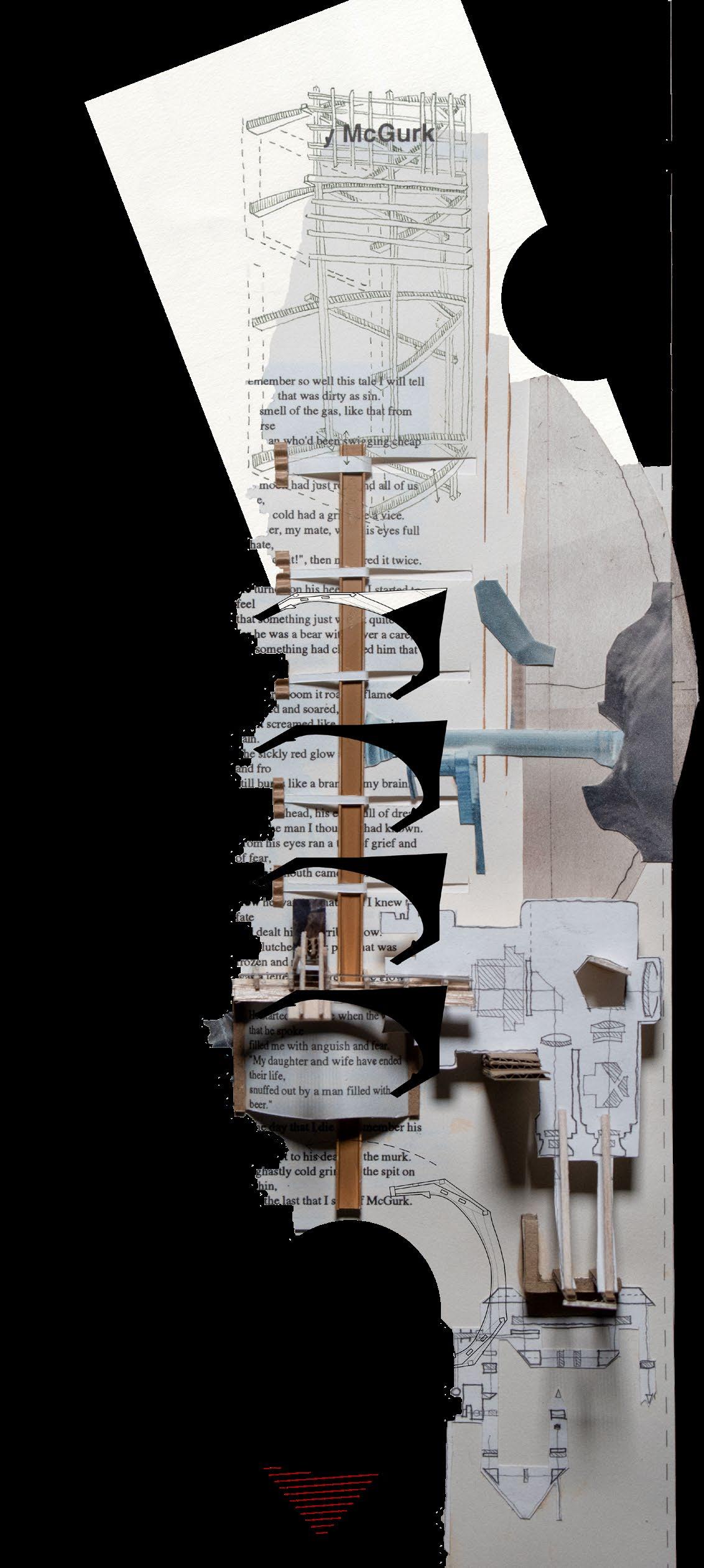 Synthesising grief into architecture, found that acts of structural wrapping were developed that encased an Oil silo. Ideologically and thetically bearing the weight of an enclosed structure, seeking to afford a sense of care to its User. The support structure, mimicking the tectonic language developed throughout the thesis, structurally appropriating a violent site of contemporary colonialism. The invention was imagined as an enclosed space that begins to care for the lives & bodies affected by violent events. Thereby, the wrapping structural notion, although appropriates a violent industry, begins to care for the structural integrity of the oil silo by aiming to non-destructively anchor itself to the sites existing structures.