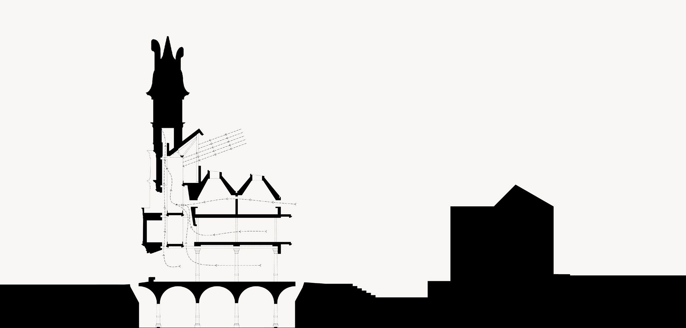 Considering the stack effect, a void is hung from the existing facade to aid ventilation within the proposed circulation zone. Additionally, this light well creates a narrow threshold that increases lux within the exhibition space below. The environmental drivers revolve around the circulation and void zones of the building’s existing façade. These zones not only trap light and re-orient it down the storeys but also act as a natural ventilation system, which seeks to utilize and optimize the stack effect. The stack effect is a system that relies on pressure differences within a building to move air out of spaces. Consequently, large open atriums pull air out of smaller, condensed spaces.