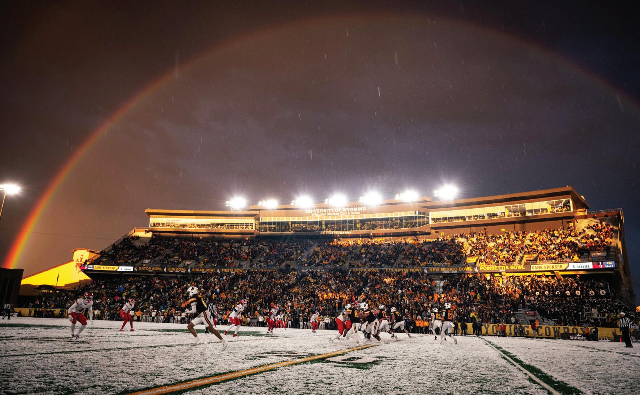 A rainbow over War Memorial Stadium, home of the University of Wyoming Cowboys, on Oct. 4, 2025, in Laramie, Wyoming.