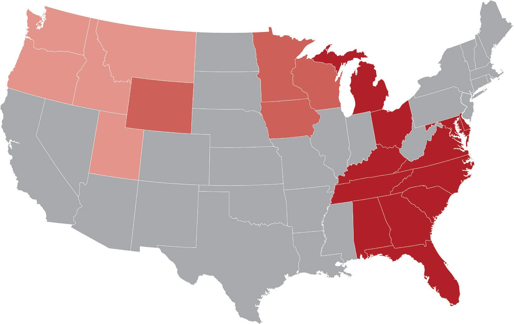 Regions: Ohio, Delaware, Maryland, District of Columbia, Kentucky, Tennessee, Virginia, North Carolina, South Carolina, Alabama, Georgia, Florida