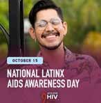 National Latino AIDS Awareness Day is Saturday, Oct. 15. Created in 2003 by the Latino Commission on Aids and the Hispanic Federation, awareness day events (on the last day of Hispanic Heritage Month) occur across Hispanic and Latino communities in the USA. Featuring awareness, condoms and testing.https://www. awarenessdays.com/awareness-days-calendar/national-latinoaids-awareness-day-2023/.