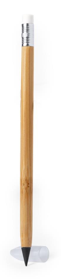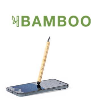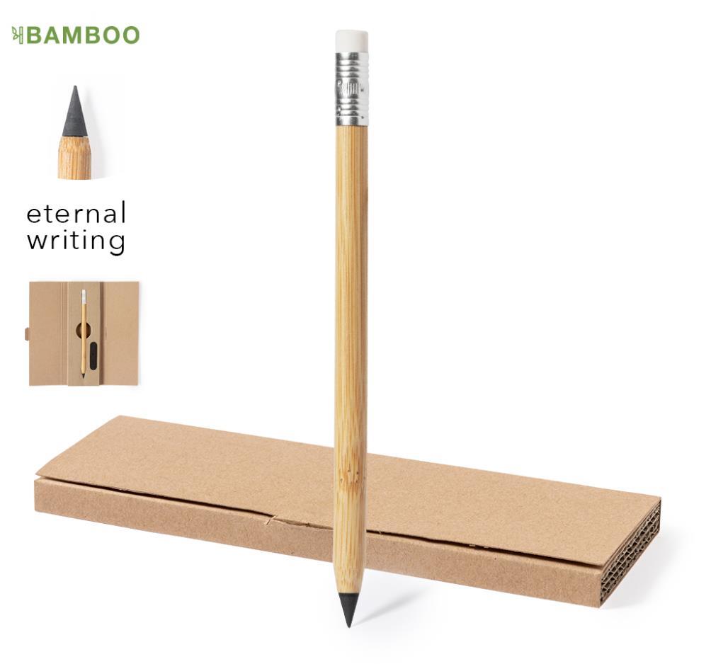 Push-button mechanism ball pen made of recycled aluminium. Bamboo push button and rubber grip, available in a wide range of stylish colours. Metallic clip and distinctive recycled aluminium on the top of the pen. Jumbo cartridge in blue ink. Presented in an individual recycled pouch.
