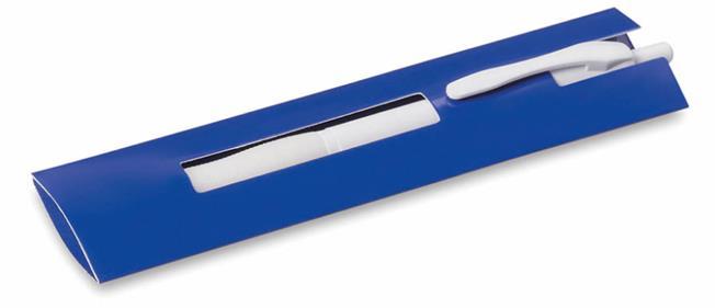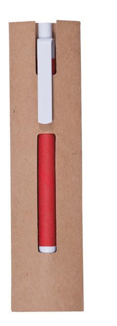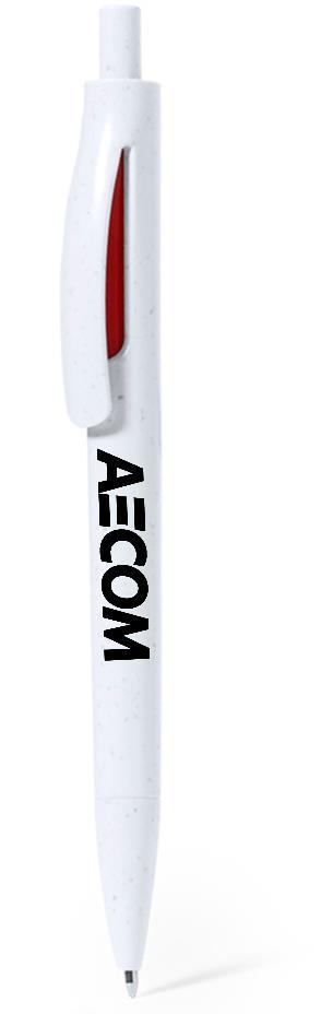 Made combination of recycled cardboard barrel in natural colour, with tip and push-button in wheat straw and wooden clip, Blue ink, with Wheat Straw emblem on the top part.