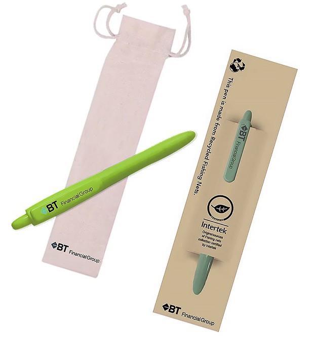 Ball pen made of RPET. Clip with large branding area, push button mechanism and blue ink. RPET logo on the top of the pen.
