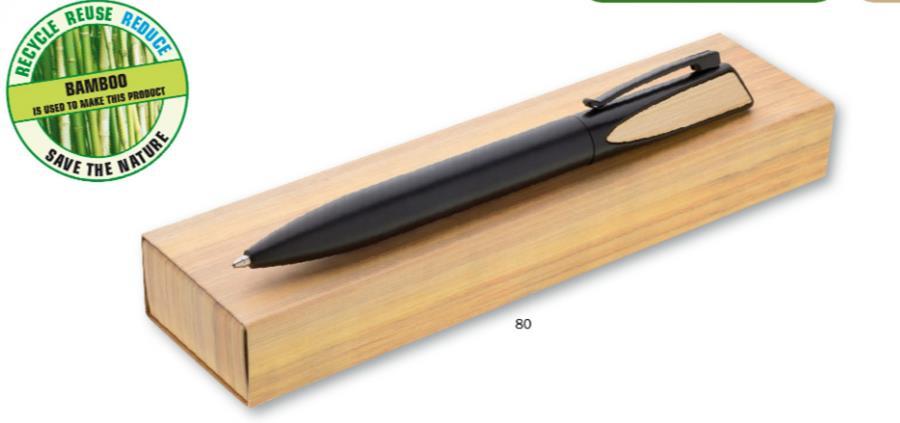 Elegant nature line ball pen with push-button mechanism. ABS body with glossy finish and bamboo grip, with matching accessories. Metal clip, with jumbo cartridge and blue ink.