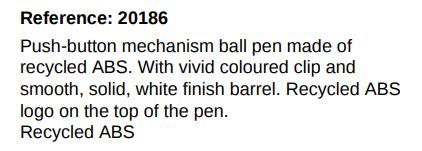 Eco-friendly ball pen manufactured in recycled aluminum, whose origin lies in the almost infinite reuse of one of the materials with the greatest potential for recyclability, while retaining its original properties. This factor makes it an eco-friendly material of recycled origin and easily recyclable. In addition, the residues obtained during the recycling process can be recovered to obtain new reusable resources, consuming less energy in its manufacturing phase, among other sustainability factors. Push-button mechanism, and available in a wide range of metallic colors, with gunmetal finish accessories. Metallic clip, blue ink and recycled aluminum logo on the upper part of the ball pen. GRS (Global Recycled Standard) certification, guaranteeing the recycled origin of the material used to manufacture the product.
