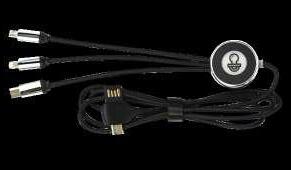 A small multi-charging cable with light-up logo to one or both sides. Presented in a black gift box.