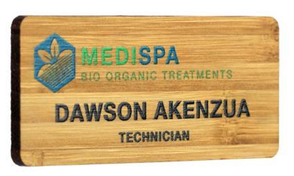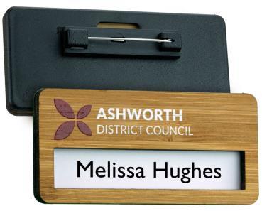Badges made of bamboo material from licensed managed forests, harvested every 5 years and made in a factory that is ISO 9001 quality and ISO 14001. Bamboo material simply biodegrades at end of life.