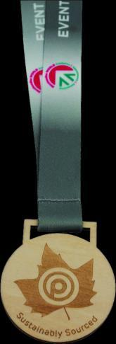 Custom shape wooden medals with V stitched polyester or rPET 80cm ribbons, printed full colour on both sides.