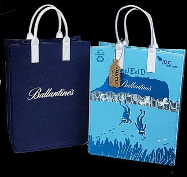 Exclusive RPET bags for Ballantine's and Royal Salute offer an added "Gift with Purchase." Made from recycled bottles. Showcasing our commitment to green practices, these bags retain top quality. Their design reflects the prestige and elegance of the brands.