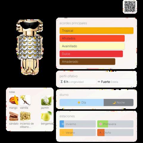 Notas: mango, vainilla, jazmín, bergamota, sándalo, incienso de olíbano, bergamota.