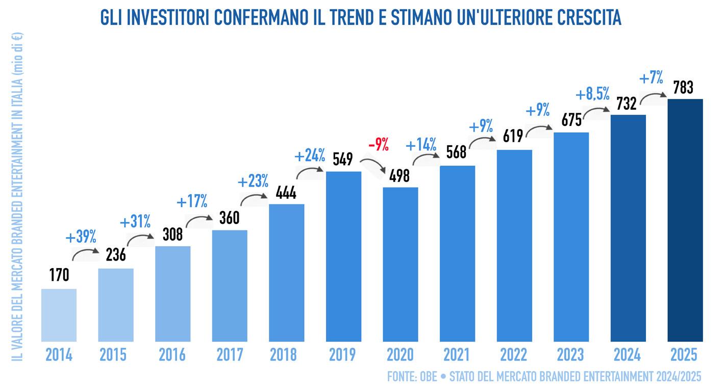 I dati lo confermano. Nel 2025 il mercato italiano del branded entertainment ha raggiunto i 783 milioni di euro, con una crescita del 7% rispetto all’anno precedente. Un risultato che evidenzia la solidità del settore e la sua crescente rilevanza.