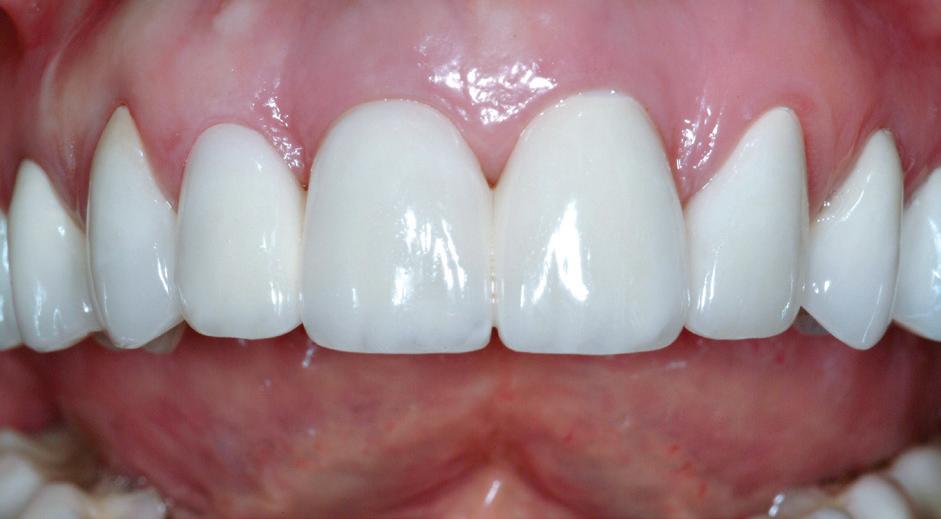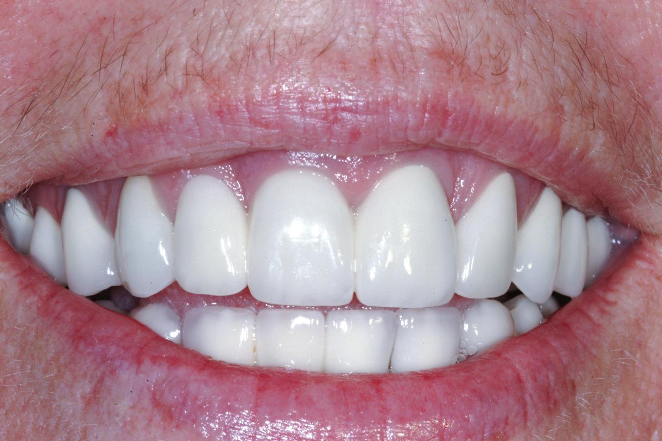 Verificarea efectuată după doi ani a demonstrat un aspect sănătos al conturului gingival (fig. 17), iar la patru ani după finalizarea cazului, era evidentă o îmbunătățire semnificativă a aspectului înclinat al marginilor gingivale (acuza principală a pacientei), notându-se stabilitatea țesutului moale și osos (fig. 18-20). Rezolvarea cu succes a acestui caz a demonstrat eficacitatea unei abordări interdisciplinare coordonate atunci când se tratează un pacient cu probleme estetice complexe.