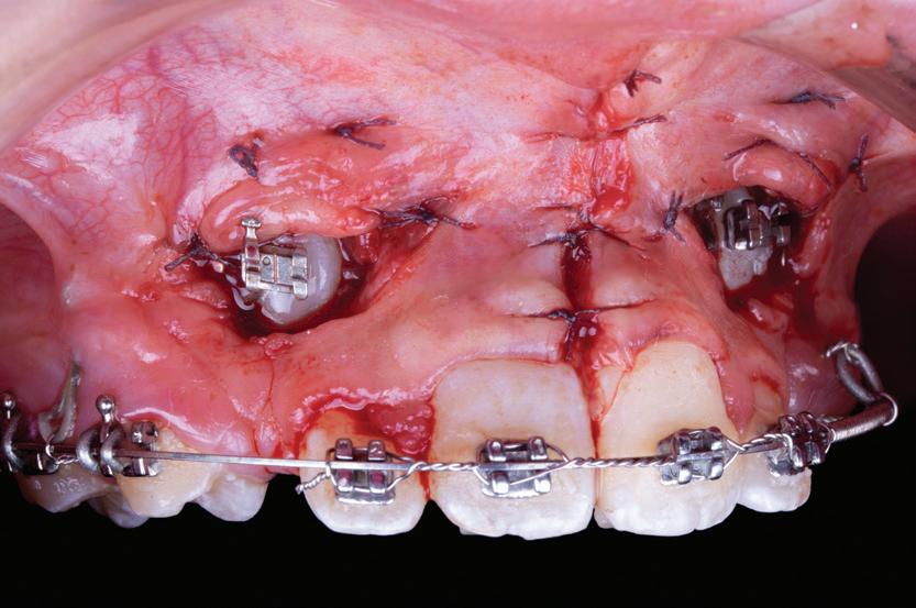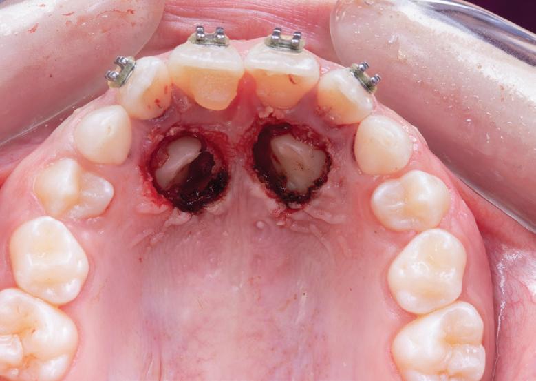 intermediul intervențiilor chirurgicale osoase. Ortodontul a propus erupția forțată a 1.2., 1.1., 2.1. și 2.3. care ar rezolva mai multe probleme. În primul rând, planul ocluzal înclinat putea fi îmbunătățit semnificativ prin erupția caninului, ce ar permite, de asemenea, obținerea unui aspect mai apropiat de cel al unui incisiv lateral. Apoi, erupția incisivilor ar putea îmbunătăți nivelul osului crestal și ar facilita un plan de tratament implantar. În urma consultărilor, s-a generat un rezumat al tuturor posibilităților de tratament și o secvențiere terapeutică pentru fiecare variantă.