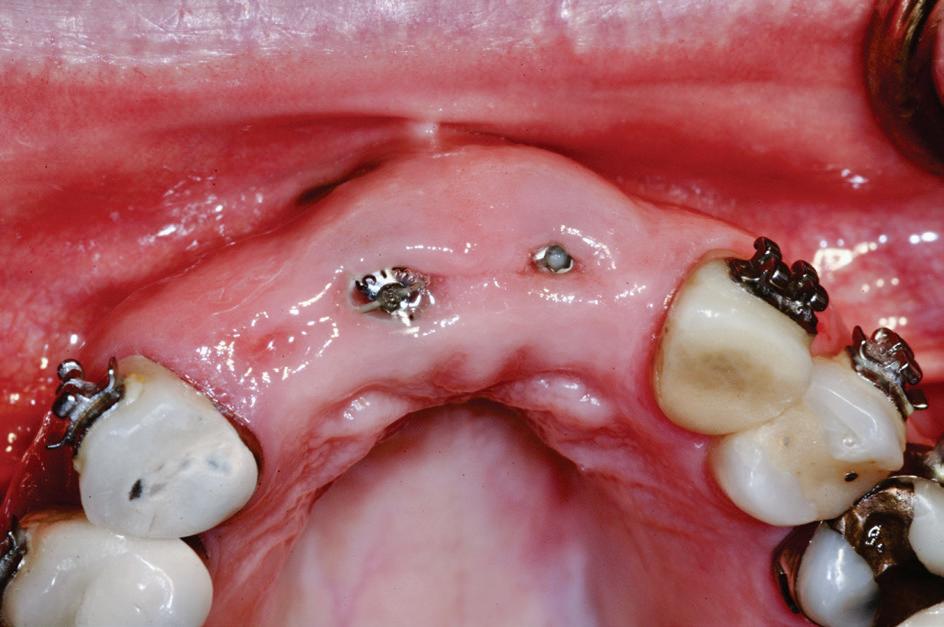 nivelul alveolei incisivului lateral drept a dictat inserarea imediată a implanturilor în locațiile celor doi centrali, urmată de augmentarea periimplantară cu amestec de particule osoase și sulfat de calciu, și fixarea bonturilor de vindecare (fig. 10). După chiuretarea țesutului de granulație, alveola lateralului 1.2. a fost augmentată cu substitut mineral osos combinat cu sulfat de calciu și membrană resorbabilă (fig. 10). Pacienta a revenit la ortodont care a fixat un arc de sârmă temporar pentru restaurarea segmentului dentar 1.2.-2.2. (fig. 11, 12). Vindecarea a decurs fără evenimente notabile.