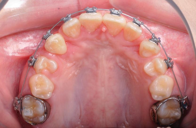 S-a inițiat terapia ortodontică de erupție forțată a celor trei incisivi și a caninului, cu deplasări programate de aproximativ 0,5-1 mm pe lună pentru o conformare optimă a crestei osoase alveolare. La fiecare vizită, ortodontul a redus din lungimea restaurărilor provizorii în vederea extrudării ulterioare. Tratamentul ortodontic s-a finalizat pe parcursul a cinci luni, iar dinții au fost stabilizați cu un arc dreptunghiular (fig. 6, 7).