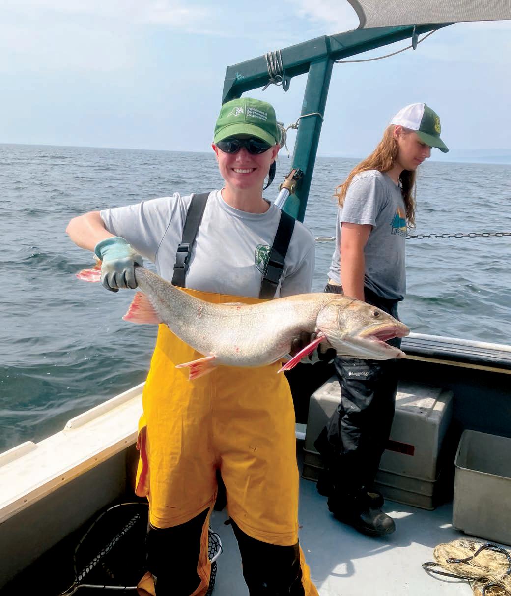 VTFWD crews began summer gillnetting surveys in 2020 as an additional assessment tool to monitor wild Lake Trout in Champlain. Here, NYSDEC fisheries biologist Nicole Balk holds a large hatchery-stocked fish while she assisted the VTFWD gillnetting crew.