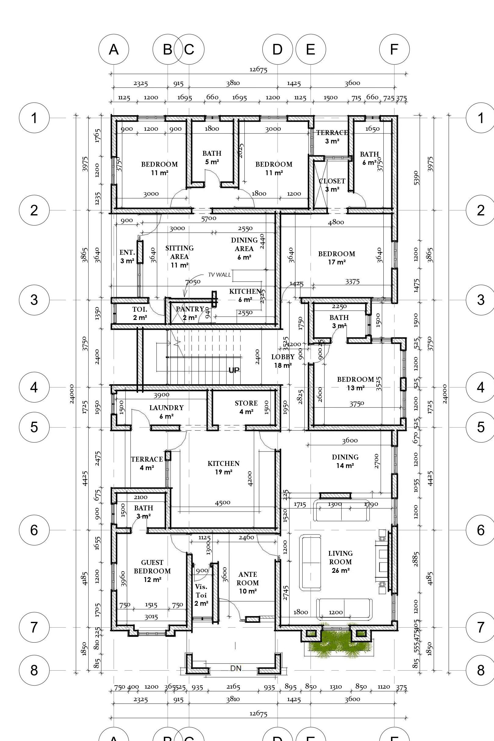 This page shows the functional distribution of the building, outlining public, semi-private, and private zones. Circulation routes were designed for intuitive movement, separating service areas from living and recreational spaces. Accessibility and flow were key in shaping user experience.
