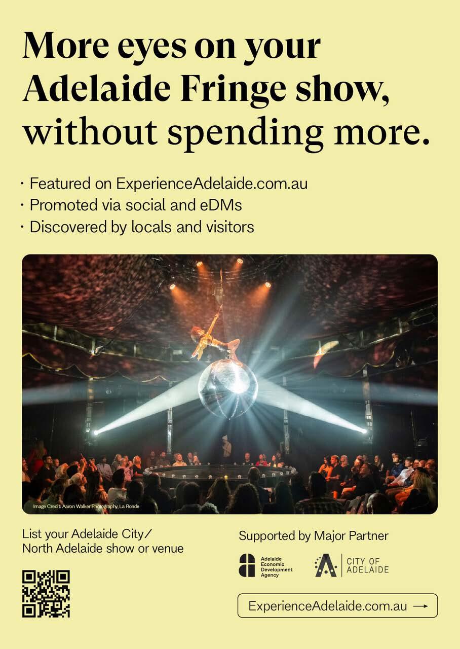Fringe is a community-led Festival and we recognise the importance of every person who contributes to its success and know everybody achieves success differently. There’s no single pathway, no guaranteed outcome, however every step of the way, know you’re not doing it alone. Artist Mag 2 is designed to support you during the festival itself. It’s a reference point for when questions come up, plans change, or you just need to quickly check how something works. Our teams are on the ground, on the phones, in venues and behind the scenes — helping solve problems, answer questions and keep things moving as the season unfolds. We are excited to have FringeWORKS based in Tandanya this year, so can't wait to see you there.