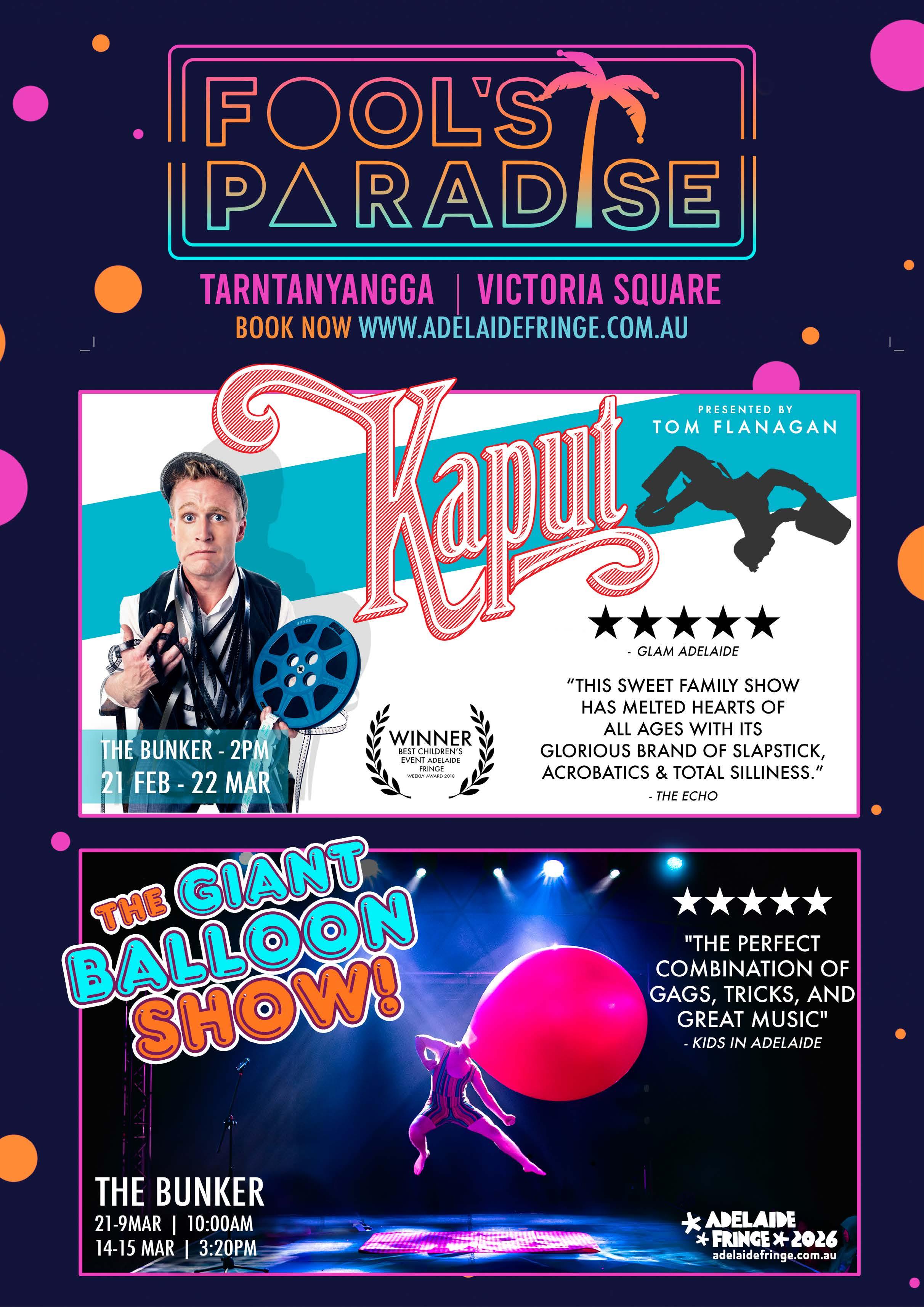 Take everything you know about balloons, add an award-winning entertainer, an ‘80s soundtrack, and twist that into a hilarious show for the whole family. ★★★★★ Gigantic 2024. ★★★★★ Kids in Adelaide. Presented by Dizzy O’Dare