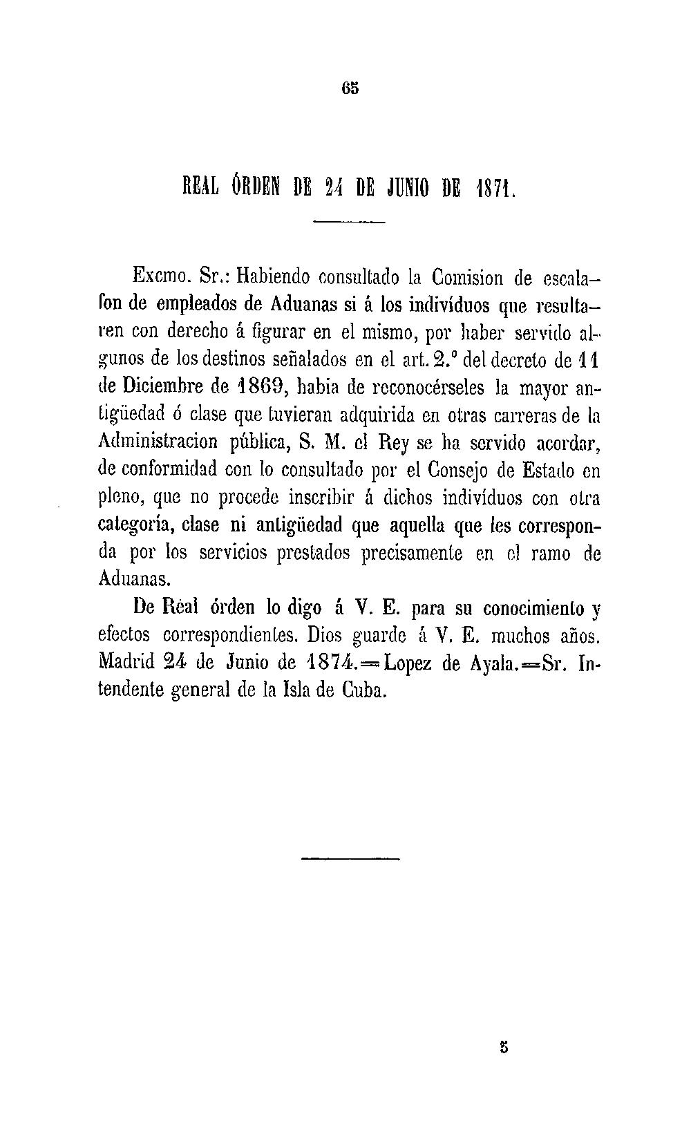 Disposiciones Creación Cuerpo Empleados de Aduanas: Cuba, Puerto Rico (1874)