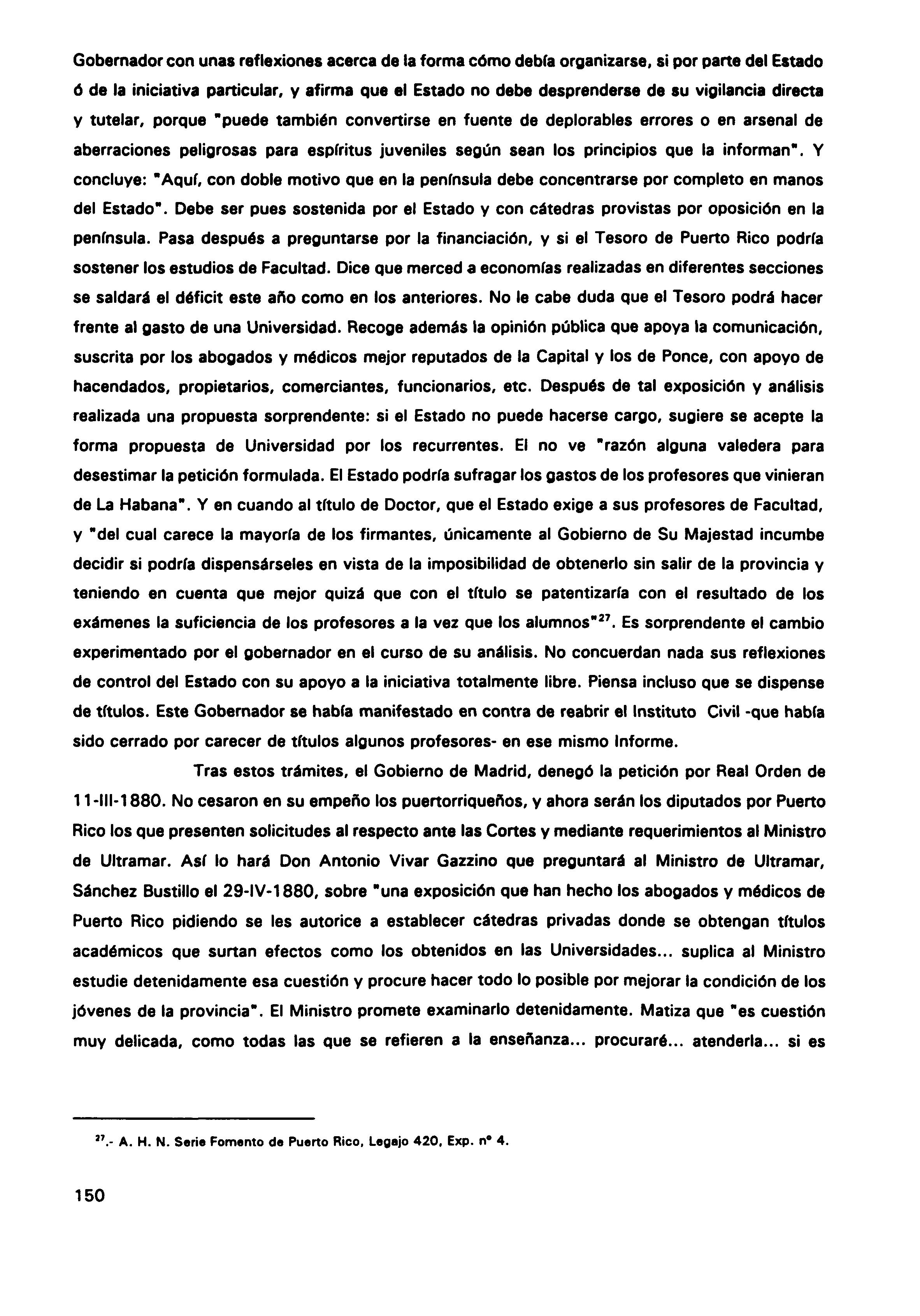 Gobernador con unas reflexiones acerca de ia forma cómo debía organizarse, si por parte del Estado ó de la iniciativa particular, y afirma que el Estado no debe desprenderse de su vigilancia directa y tutelar, porque 'puede también convertirse en fuente de deplorables errores o en arsenal de aberraciones peligrosas para espíritus juveniles según sean los principios que la informan" Y concluye: "Aquí, con doble motivo que en la península debe concentrarse por completo en manos del Estado" Debe ser pues sostenida por el Estado y con cátedras provistas por oposición en la península. Pasa después a preguntarse por la financiación, y si el Tesoro de Puerto Rico podría sostener los estudios de Facultad Dice que merced a economías realizadas en diferentes secciones se saldará el déficit este año como en los anteriores. No le cabe duda que el Tesoro podrá hacer frente al gasto de una Universidad Recoge además la opinión pública que apoya la comunicación, suscrita por los abogados y médicos mejor reputados de la Capital y los de Ponce, con apoyo de hacendados, propietarios, comerciantes, funcionarios, etc Después de tal exposición y análisis realizada una propuesta sorprendente: si el Estado no puede hacerse cargo, sugiere se acepte la forma propuesta de Universidad por los recurrentes El no ve "razón alguna valedera para desestimar la petición formulada. El Estado podría sufragar los gastos de los profesores que vinieran de La Habana" Y en cuando al título de Doctor, que el Estado exige a sus profesores de Facultad, y "del cual carece la mayoría de los firmantes, únicamente al Gobierno de Su Majestad incumbe decidir si podría dispensárseles en vista de la imposibilidad de obtenerlo sin salir de la provincia y teniendo en cuenta que mejor quizá que con el título se patentizaría con el resultado de los exámenes la suficiencia de los profesores a la vez que los alumnos"^^. Es sorprendente el cambio experimentado por el gobernador en el curso de su análisis. No concuerdan nada sus reflexiones de control del Estado con su apoyo a la iniciativa totalmente libre. Piensa incluso que se dispense de títulos. Este Gobernador se había manifestado en contra de reabrir el Instituto Civil -que había sido cerrado por carecer de títulos algunos profesores- en ese mismo Informe.