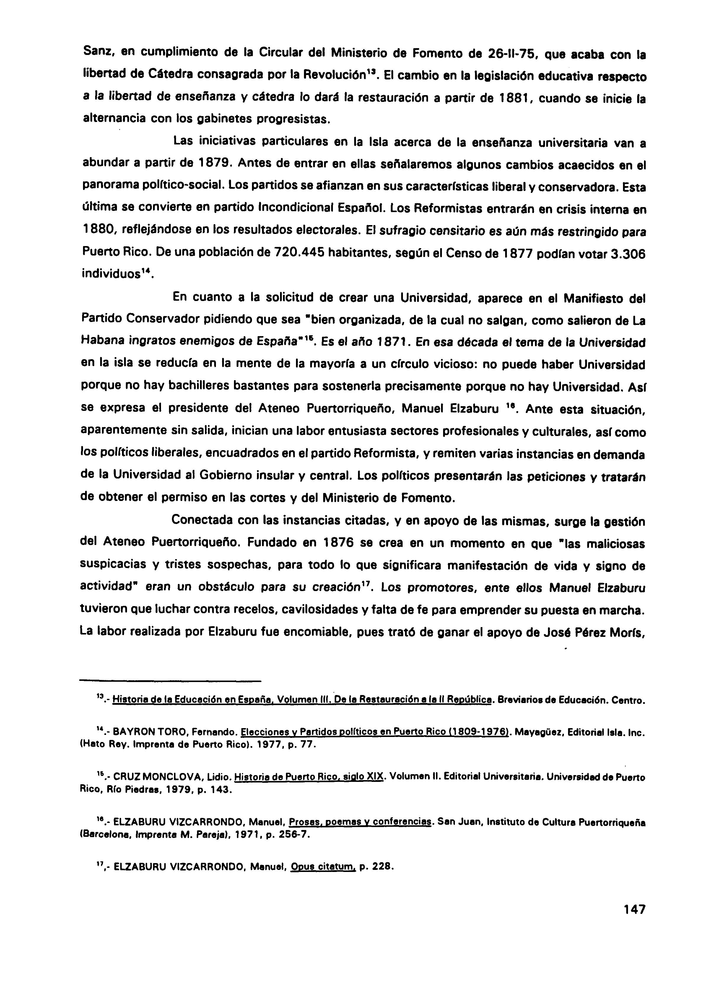 En cuanto a la solicitud de crear una Universidad, aparece en el Manifiesto del Partido Conservador pidiendo que sea "bien organizada, de la cual no salgan, como salieron de La Habana ingratos enemigos de España"^*. Es el año 1871. En esa década el tema de la Universidad en la isla se reducía en la mente de la mayoría a un círculo vicioso: no puede haber Universidad porque no hay bachilleres bastantes para sostenerla precisamente porque no hay Universidad. Así se expresa el presidente del Ateneo Puertorriqueño, Manuel Elzaburu ^' Ante esta situación, aparentemente sin salida, inician una labor entusiasta sectores profesionales y culturales, así como los políticos liberales, encuadrados en el partido Reformista, y remiten varias instancias en demanda de la Universidad al Gobierno insular y central. Los políticos presentarán las peticiones y tratarán de obtener el permiso en las cortes y del Ministerio de Fomento.