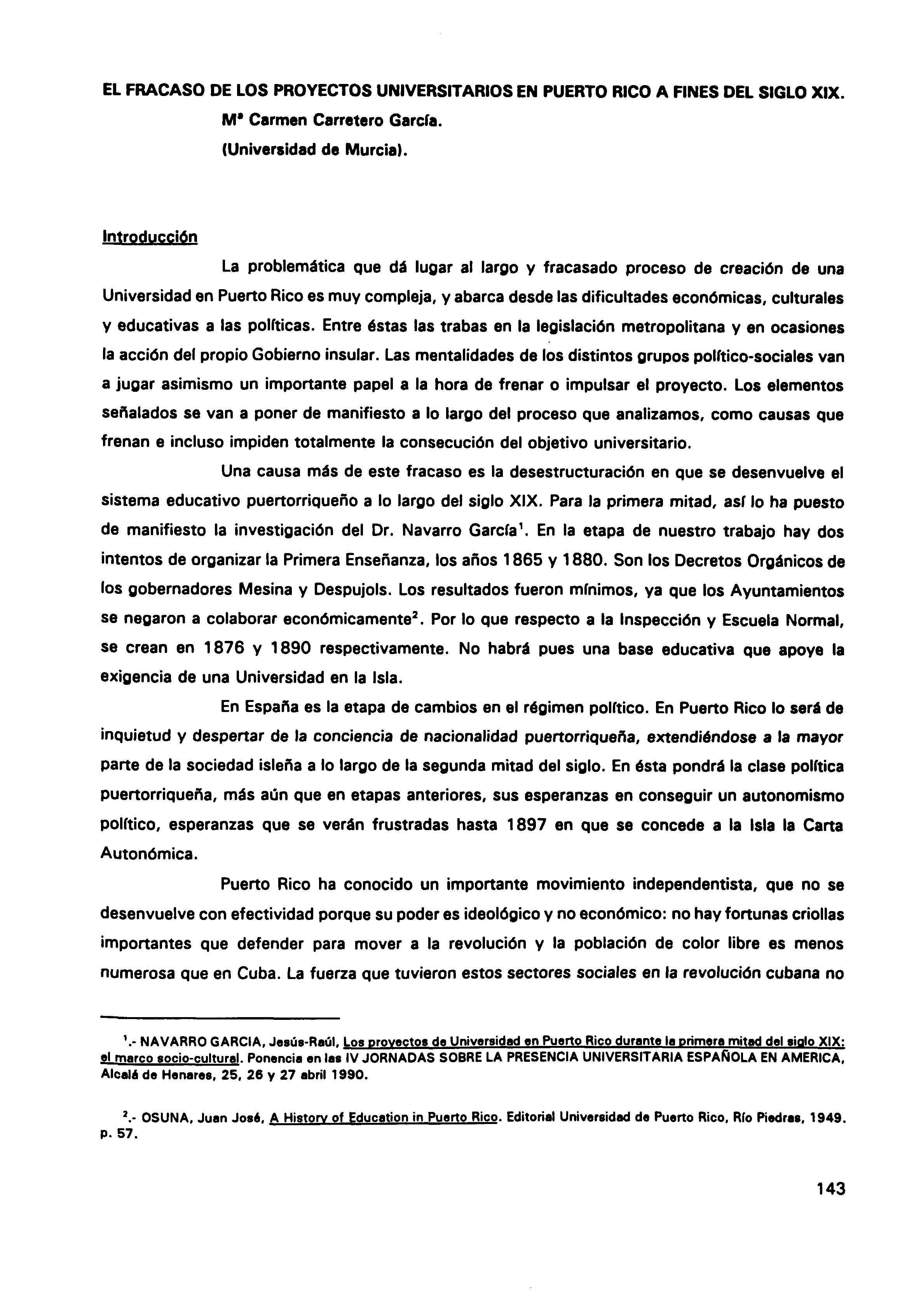 '.- NAVARRO GARCÍA, Jesús-Raúl, Los provectos de Univorsidad en Puerto Rico durante la primera mitad del siglo XIX: el marco socio-cultural. Ponencia en las IV JORNADAS SOBRE LA PRESENCIA UNIVERSITARIA ESPAÑOLA EN AMERICA, Alcalá de Henares, 25, 26 y 27 abril 1990