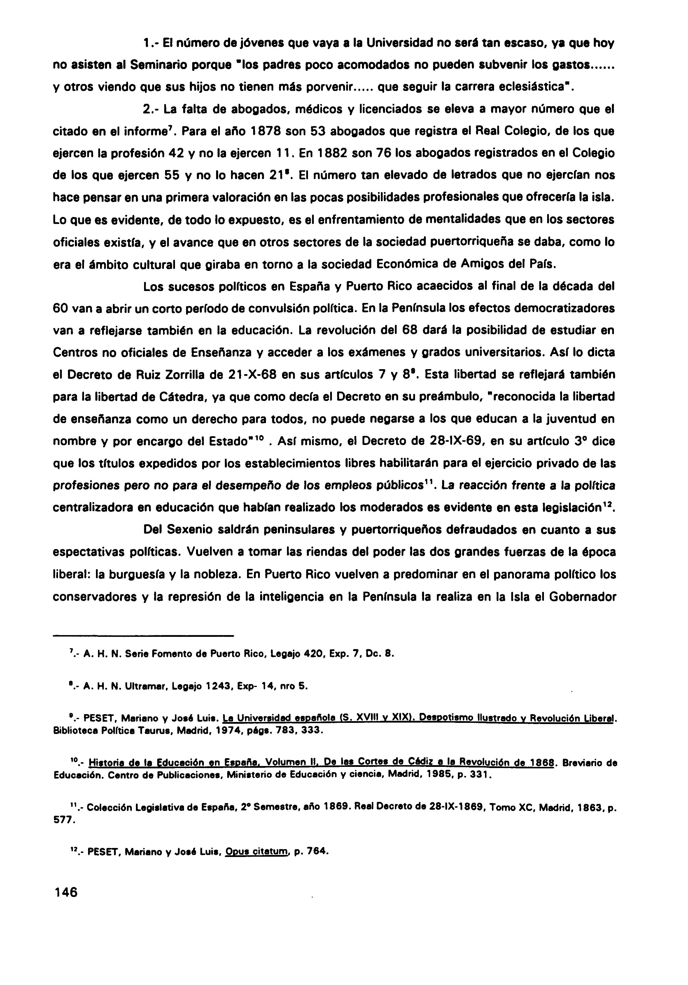 Los sucesos políticos en España y Puerto Rico acaecidos al final de la década del 60 van a abrir un corto período de convulsión política. Enla Península los efectos democratizadores van a reflejarse también en la educación. La revolución del 68 dará la posibilidad de estudiar en Centros no oficiales de Enseñanza y acceder a los exámenes y grados universitarios. Así lo dicta el Decreto de Ruiz Zorrilla de 21-X-68 en sus artículos 7 y 8*. Esta libertad se reflejará también para la libertad de Cátedra, ya que como decía el Decreto en su preámbulo, "reconocida la libertad de enseñanza como un derecho para todos, no puede negarse a los que educan a la juventud en nombre y por encargo del Estado" ^° . Así mismo, el Decreto de 28-IX-69, en su artículo 3° dice que los títulos expedidos por los establecimientos libres habilitarán para el ejercicio privado de las profesiones pero no para el desempeño de los empleos públicos^\ La reacción frente a la política centralizadora en educación que habían realizado los moderados es evidente en esta legislación^^ Del Sexenio saldrán peninsulares y puertorriqueños defraudados en cuanto a sus espectativas políticas Vuelven a tomar las riendas del poder las dos grandes fuerzas de la época liberal: la burguesía y la nobleza. En Puerto Rico vuelven a predominar en el panorama político los conservadores y la represión de la inteligencia en la Península la realiza en la Isla el Gobernador