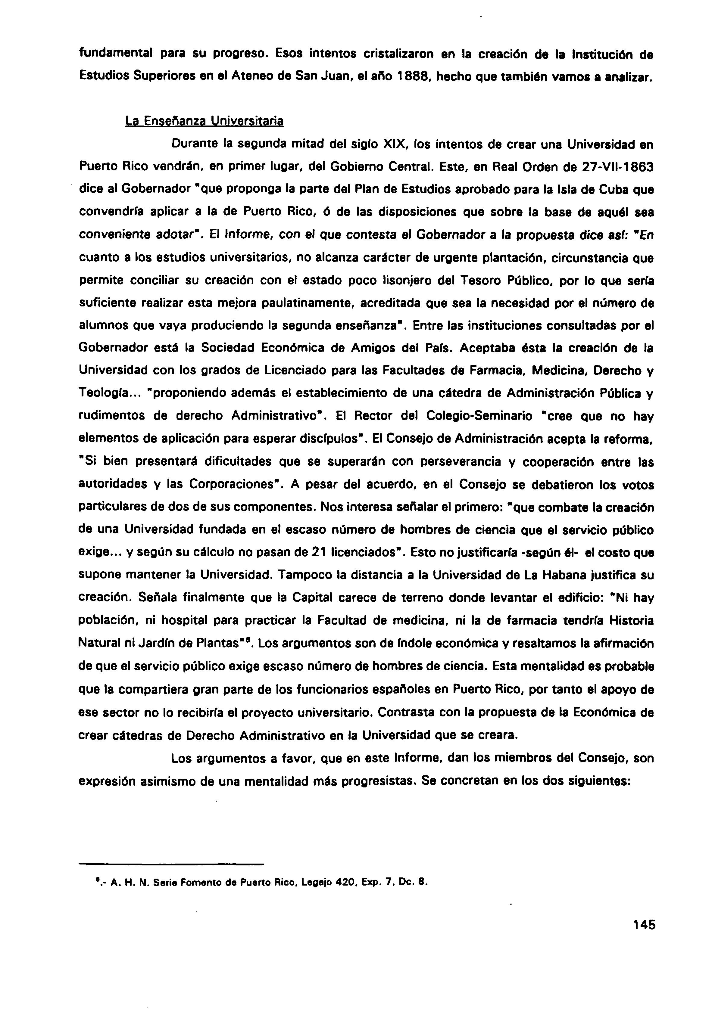 Durante la segunda mitad del siglo XIX, los intentos de crear una Universidad en Puerto Rico vendrán, en primer lugar, del Gobierno Central. Este, en Real Orden de 27-VII-1863 dice al Gobernador "que proponga la parte del Plan de Estudios aprobado para la Isla de Cuba que convendría aplicar a la de Puerto Rico, ó de las disposiciones que sobre la base de aquél sea conveniente adotar" El Informe, con el que contesta el Gobernador a la propuesta dice así: "En cuanto a los estudios universitarios, no alcanza carácter de urgente plantación, circunstancia que permite conciliar su creación con el estado poco lisonjero del Tesoro Público, por lo que sería suficiente realizar esta mejora paulatinamente, acreditada que sea la necesidad por el número de alumnos que vaya produciendo la segunda enseñanza". Entre las instituciones consultadas por el Gobernador está la Sociedad Económica de Amigos del País Aceptaba ésta la creación de la Universidad con los grados de Licenciado para las Facultades de Farmacia, Medicina, Derecho y Teología... 'proponiendo además el establecimiento de una cátedra de Administración Pública y rudimentos de derecho Administrativo". El Rector del Colegio-Seminario "cree que no hay elementos de aplicación para esperar discípulos". El Consejo de Administración acepta la reforma, "Si bien presentará dificultades que se superarán con perseverancia y cooperación entre las autoridades y las Corporaciones" A pesar del acuerdo, en el Consejo se debatieron los votos particulares de dos de sus componentes. Nos interesa señalar el primero: "que combate la creación de una Universidad fundada en el escaso número de hombres de ciencia que el servicio público exige... y según su cálculo no pasan de 21 licenciados". Esto nojustificaría -según él- el costo que supone mantener la Universidad Tampoco la distancia a la Universidad de La Habana justifica su creación Señala finalmente que la Capital carece de terreno donde levantar el edificio: "Ni hay población, ni hospital para practicar la Facultad de medicina, ni la de farmacia tendría Historia Natural ni Jardín de Plantas"'. Los argumentos son de índole económica y resaltamos la afirmación de que el servicio público exige escaso número de hombres de ciencia. Esta mentalidad es probable que la compartiera gran parte de los funcionarios españoles en Puerto Rico, por tanto el apoyo de ese sector no lo recibiría el proyecto universitario Contrasta con la propuesta de la Económica de crear cátedras de Derecho Administrativo en la Universidad que se creara.