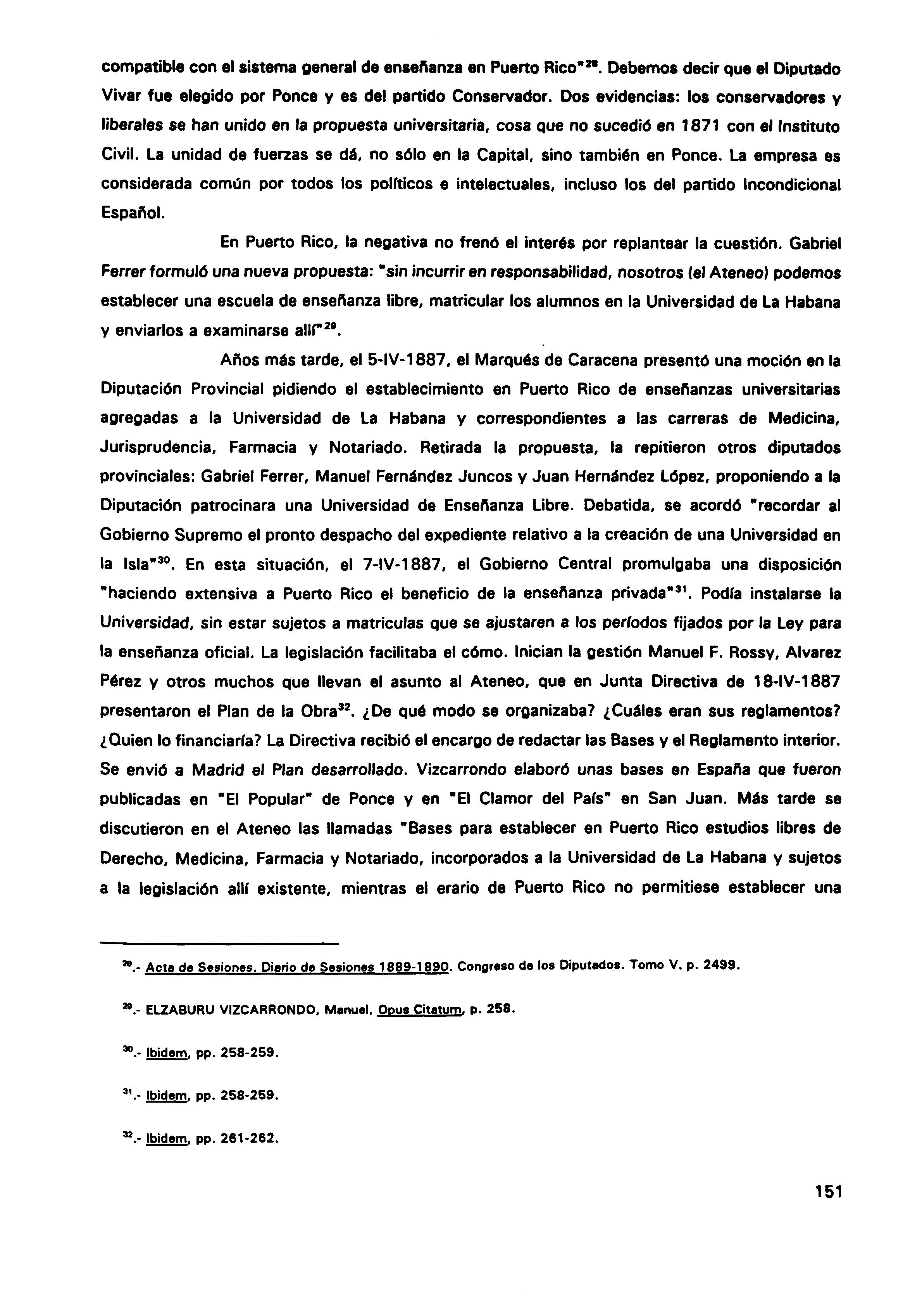 Años más tarde, el 5-IV-1887, el Marqués de Caracena presentó una moción en la Diputación Provincial pidiendo el establecimiento en Puerto Rico de enseñanzas universitarias agregadas a la Universidad de La Habana y correspondientes a las carreras de Medicina, Jurisprudencia, Farmacia y Notariado. Retirada la propuesta, la repitieron otros diputados provinciales: Gabriel Ferrer, Manuel Fernández Juncos y Juan Hernández López, proponiendo a la Diputación patrocinara una Universidad de Enseñanza Libre. Debatida, se acordó "recordar al Gobierno Supremo el pronto despacho del expediente relativo a la creación de una Universidad en la lsla"'° En esta situación, el 7-IV-1887, el Gobierno Central promulgaba una disposición "haciendo extensiva a Puerto Rico el beneficio de la enseñanza privada"'\ Podía instalarse la Universidad, sin estar sujetos a matriculas que se ajustaren a los períodos fijados por la Ley para la enseñanza oficial. La legislación facilitaba el cómo. Inician la gestión Manuel F. Rossy, Alvarez Pérez y otros muchos que llevan el asunto al Ateneo, que en Junta Directiva de 18-IV-1887 presentaron el Plan de la Obra". ¿De qué modo se organizaba? ¿Cuáles eran sus reglamentos? ¿Quien lo financiaría? La Directiva recibió el encargo de redactar las Bases y el Reglamento interior. Se envió a Madrid el Plan desarrollado. Vizcarrondo elaboró unas bases en España que fueron publicadas en "El Popular" de Ponce y en "El Clamor del País" en San Juan. Más tarde se discutieron en el Ateneo las llamadas "Bases para establecer en Puerto Rico estudios libres de Derecho, Medicina, Farmacia y Notariado, incorporados a la Universidad de La Habana y sujetos a la legislación allí existente, mientras el erario de Puerto Rico no permitiese establecer una