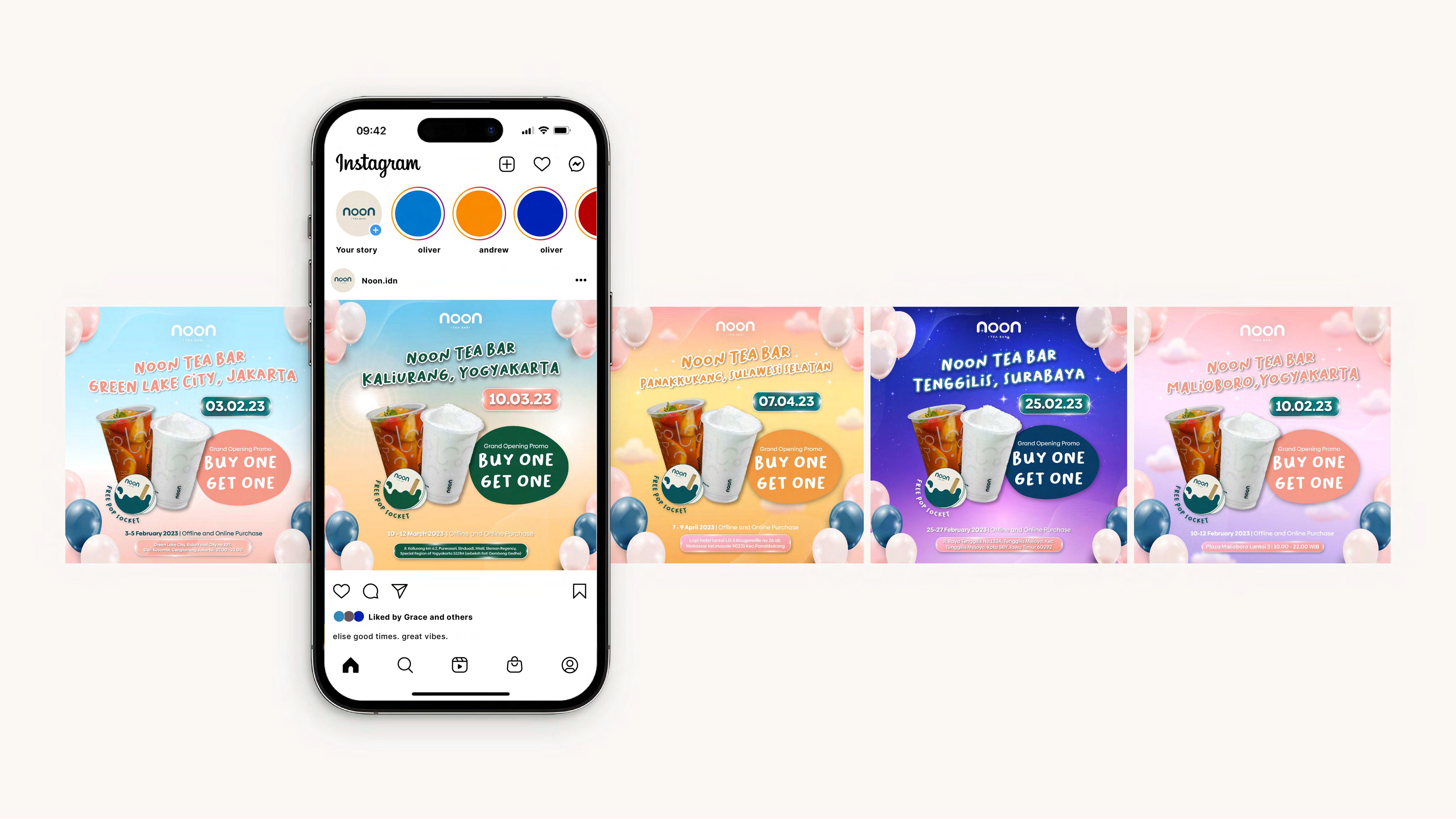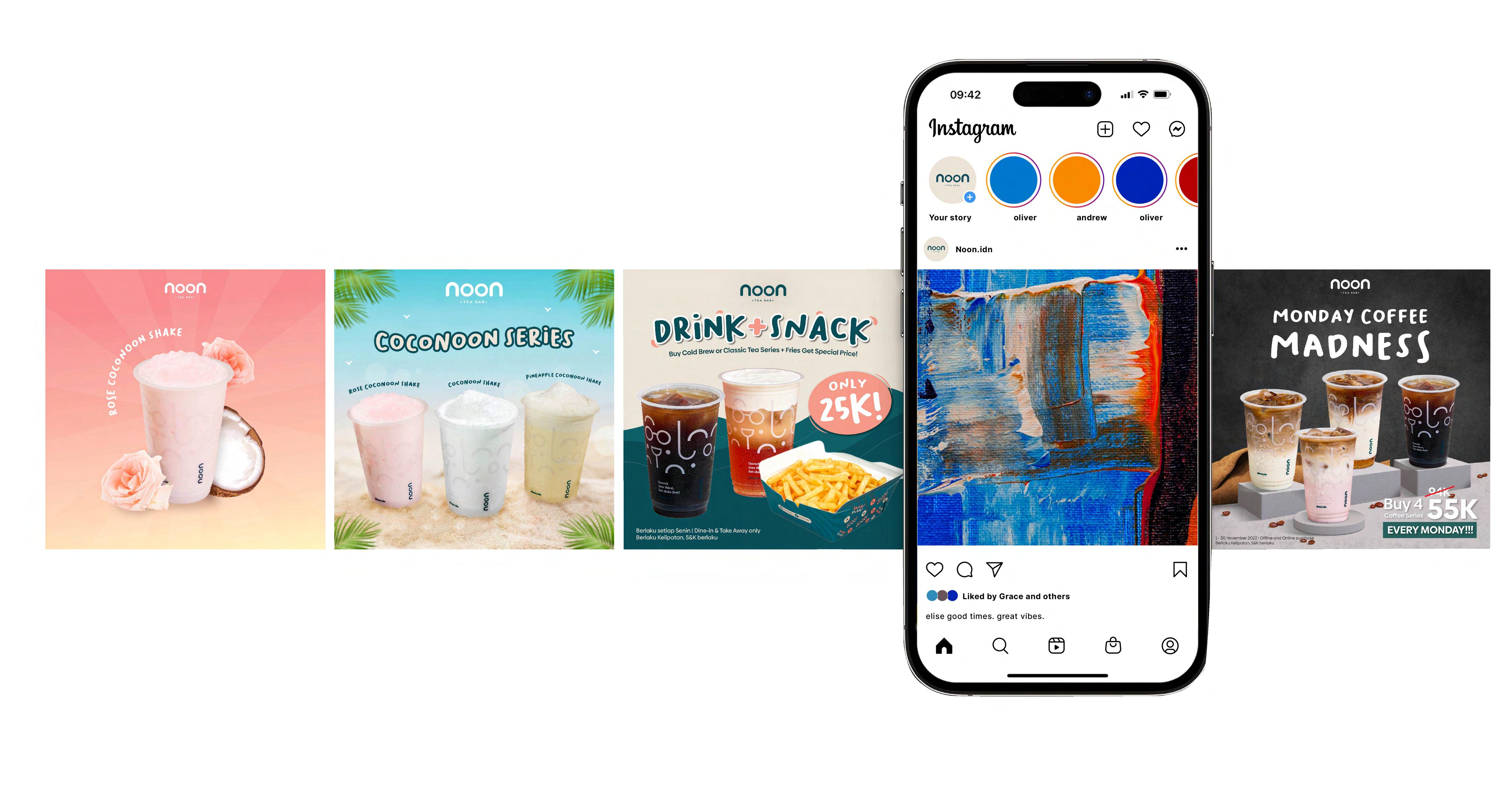 Noon Tea Bar is a food and beverage brand from Jakarta, with several branches across Indonesia. During my full-time tenure here, I developed the visual identity, collateral design,and social media presence for the brand.