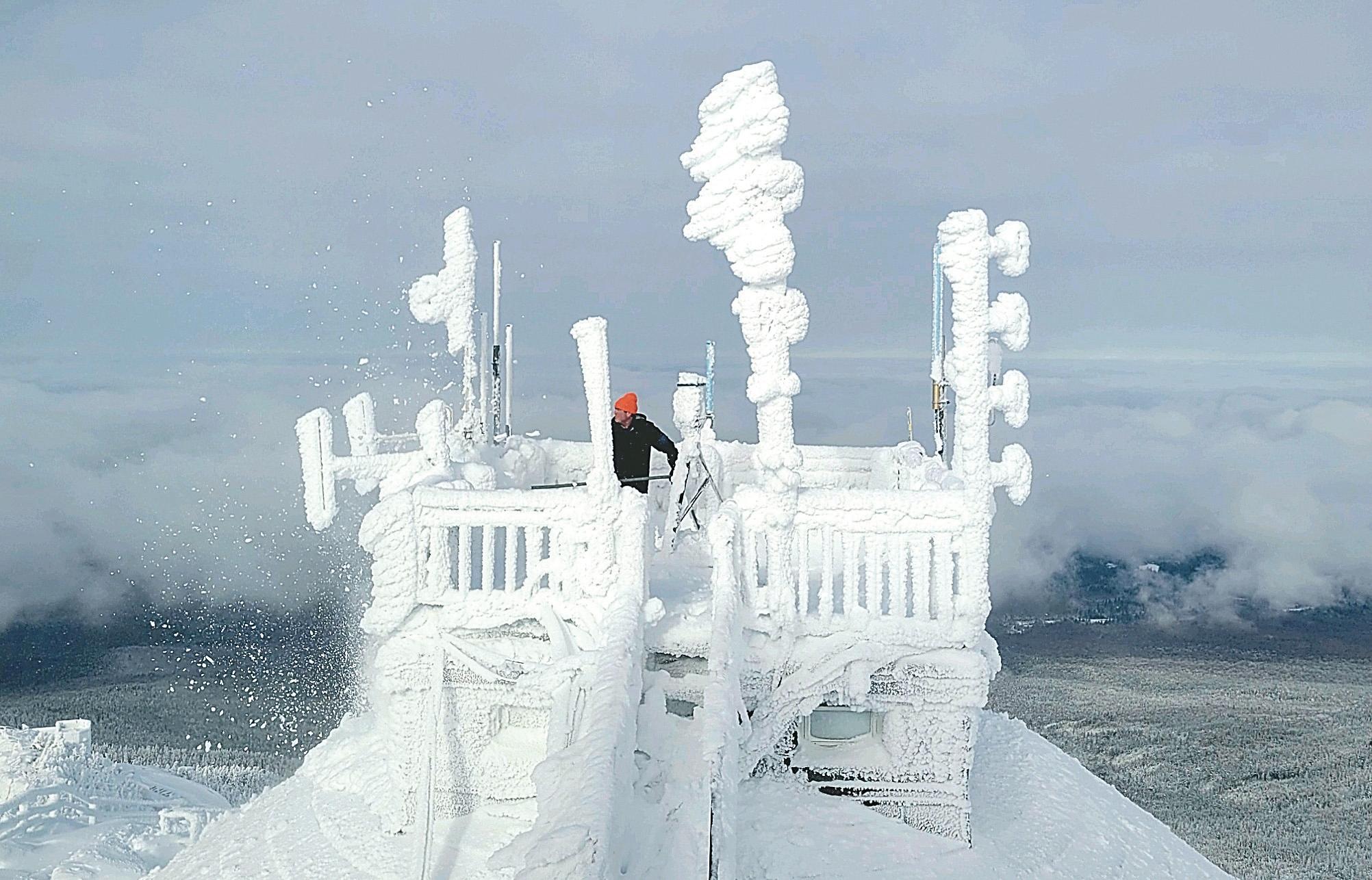 The summit of Whiteface Mountain is home to sensitive equipment that collects data about the weather and air quality. In winter, snow can accumulate on the equipment, necessitating weekly trips to the summit b y trained professionals to service the equipment. (Provided photo — Scott McKim)