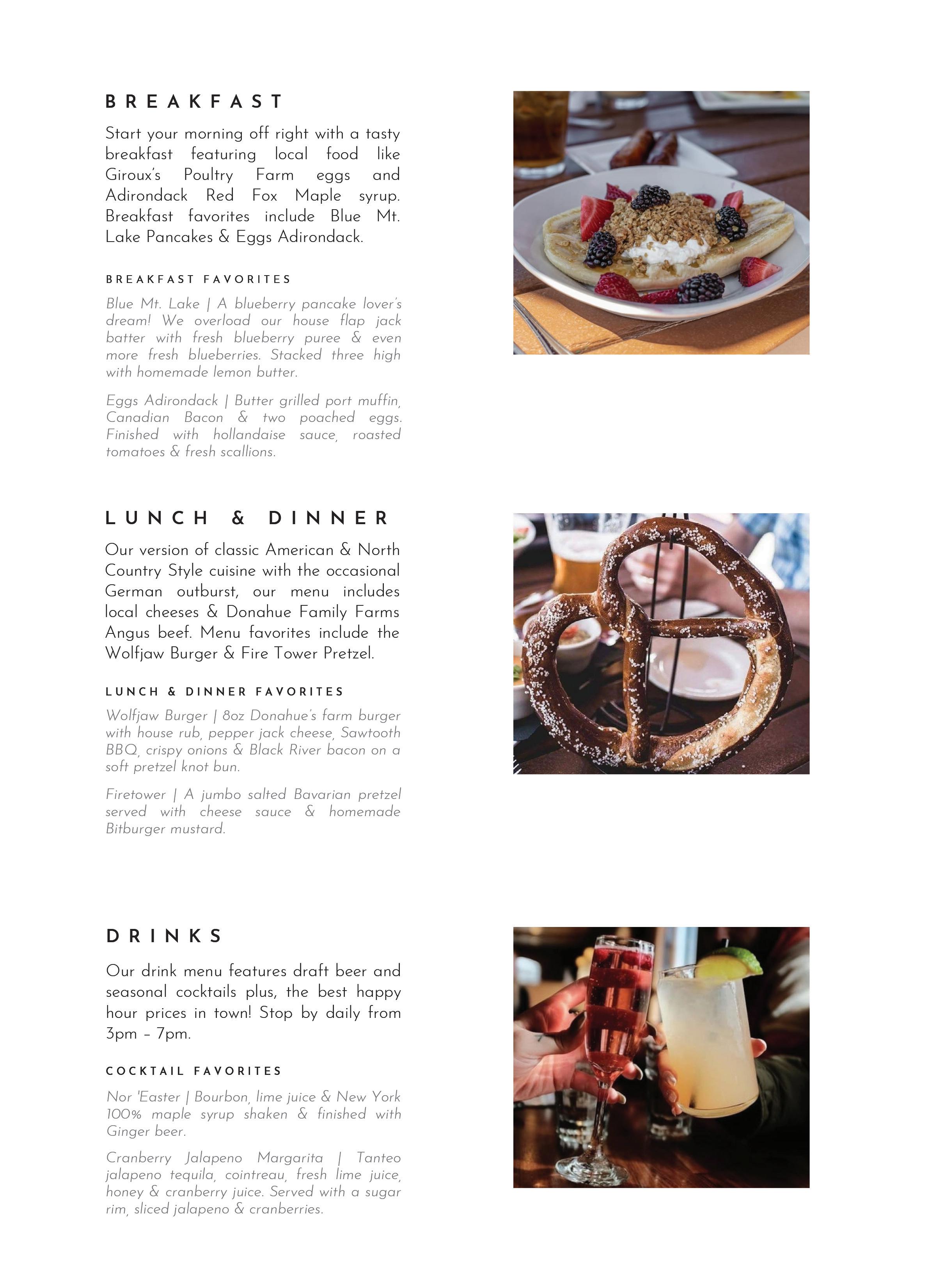 Join 3 generations of the Hohmeyer family and our award winning Adirondack Alps Restaurant where we fuse Adirondack farm foods with Old World savory spices. Entree choices range from Lodge Garden Vegetable Strudel and Schnitzels to Adirondack Grass-fed Beef Stroganoff and Adirondack Smoked Pork. Nightly menu varies based on farm-fresh ingredients.