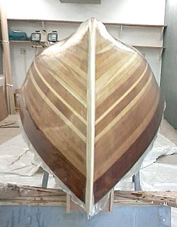 This classic guideboat features the stream line hull design from world class marine architect Nick Schade. The hull shape and structure are accomplished by edge-gluing long strips of various cedar strips together in a tongue and groove fashion known as “bead and cove”. The hull is next fiber-glassed over inside and out, then drenched with 3 coats of epoxy, and many coats of varnish. This results in a beautiful, watertight, lightweight, durable, fast, stable and extremely strong watercraft, “A Classic that will last a lifetime, handed down through generations.”