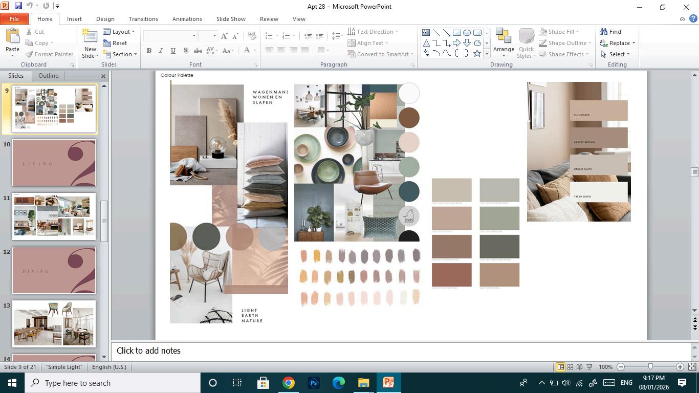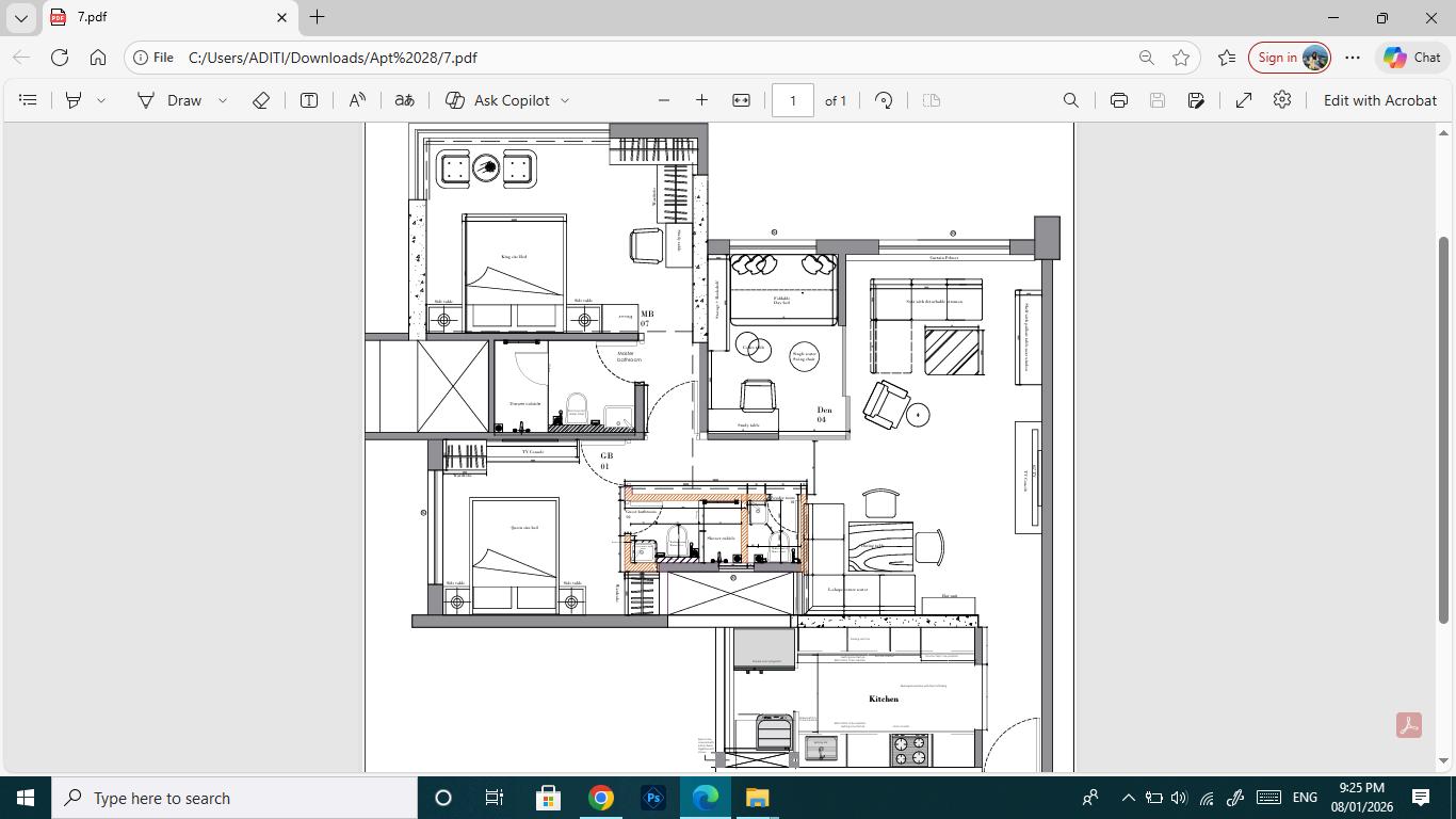 This residential project features a two-bedroom home with a den, a parallel kitchen, and a combined living and dining area. Designed for a young, ambitious couple, the space integrates a dedicated work area with a modern yet earthy aesthetic. The planning emphasizes functionality and flow, with furniture layouts detailed to scale to ensure comfort, efficiency, and visual balance.