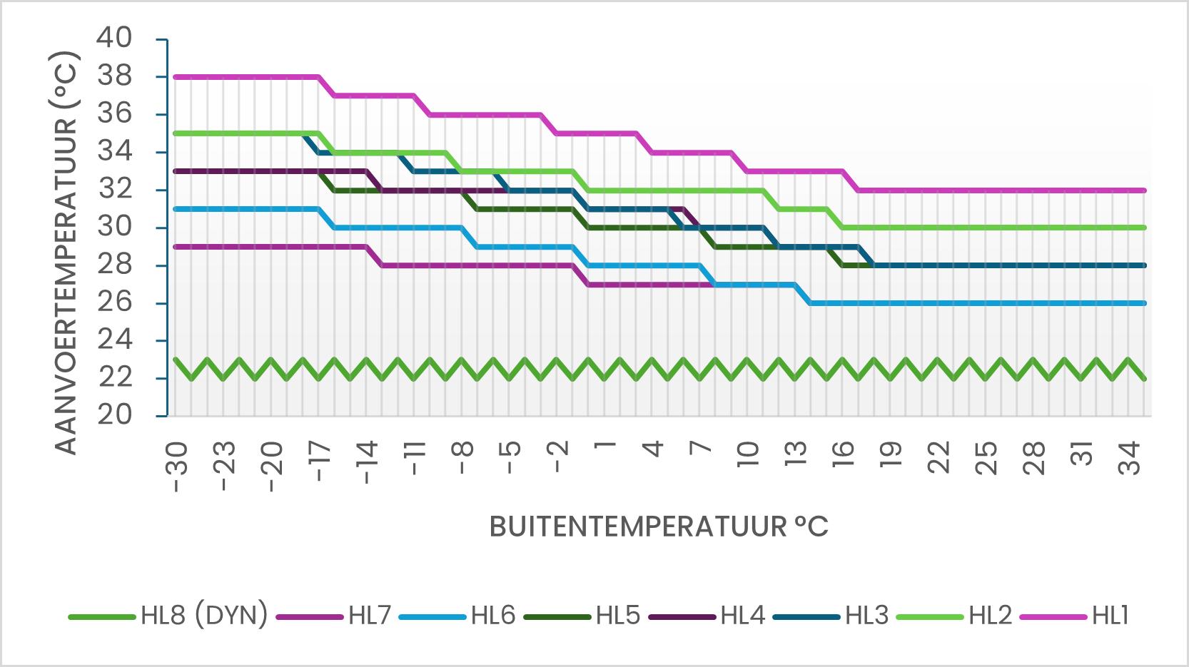 Siehe „Heizkurven Heizen“ auf Seite 16 und „Heizkurven Kühlen“ auf Seite 17.