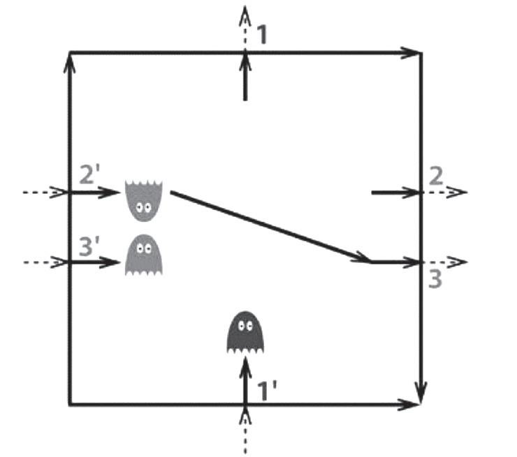 Esse objeto é a superfície obtida ao se costurar borda a borda duas bandas de Mœbius (ou então duas mitras de cross-cap). Nós nos movemos como na superfície do jogo de videogame Pac-Man, o comedor de fantasmas. Quando Blinky, o fantasma vermelho (em cinza escuro na Figura 15.1), sai por cima (1), ele volta por baixo (1’), e quando Clyde, o fantasma laranja (em cinza claro na Figura 15.1), sai pela direita (2), ei-lo novamente entrando pela esquerda. Com a diferença de que, nesse caso, ele entrará de cabeça para baixo (2’). E se, andando assim de cabeça para baixo, ele sair pela direita (3), ele voltará a entrar pela esquerda, andando de novo sobre os pés (3’). Pois o quadrado da tela, conforme as bordas com flechas indicadas na figura, é uma garrafa de Klein quando identificamos, recolamos a borda esquerda na borda direita depois de torcê-la meia volta e identificamos e colamos, sem torcer, a borda inferior à borda superior.