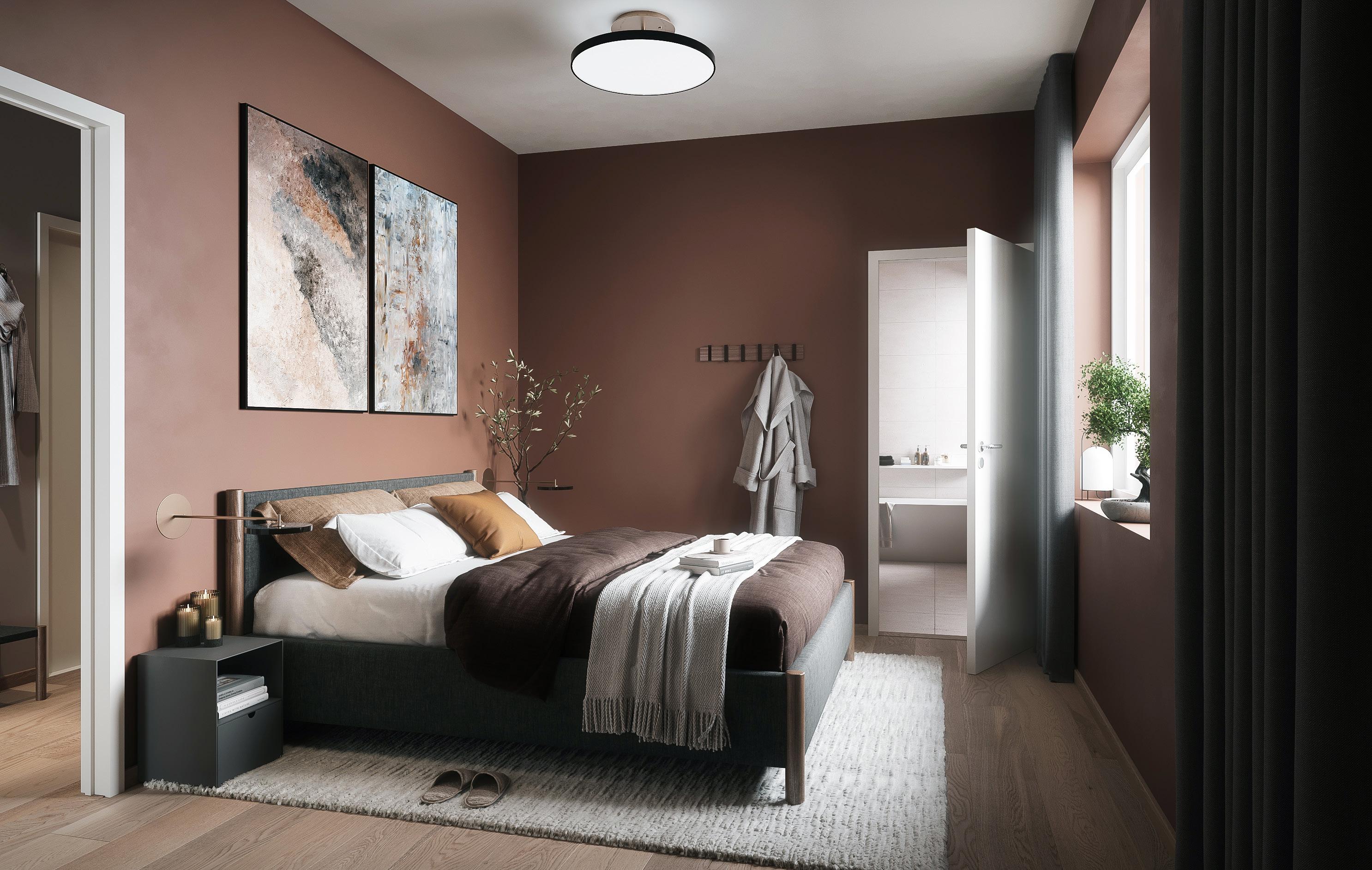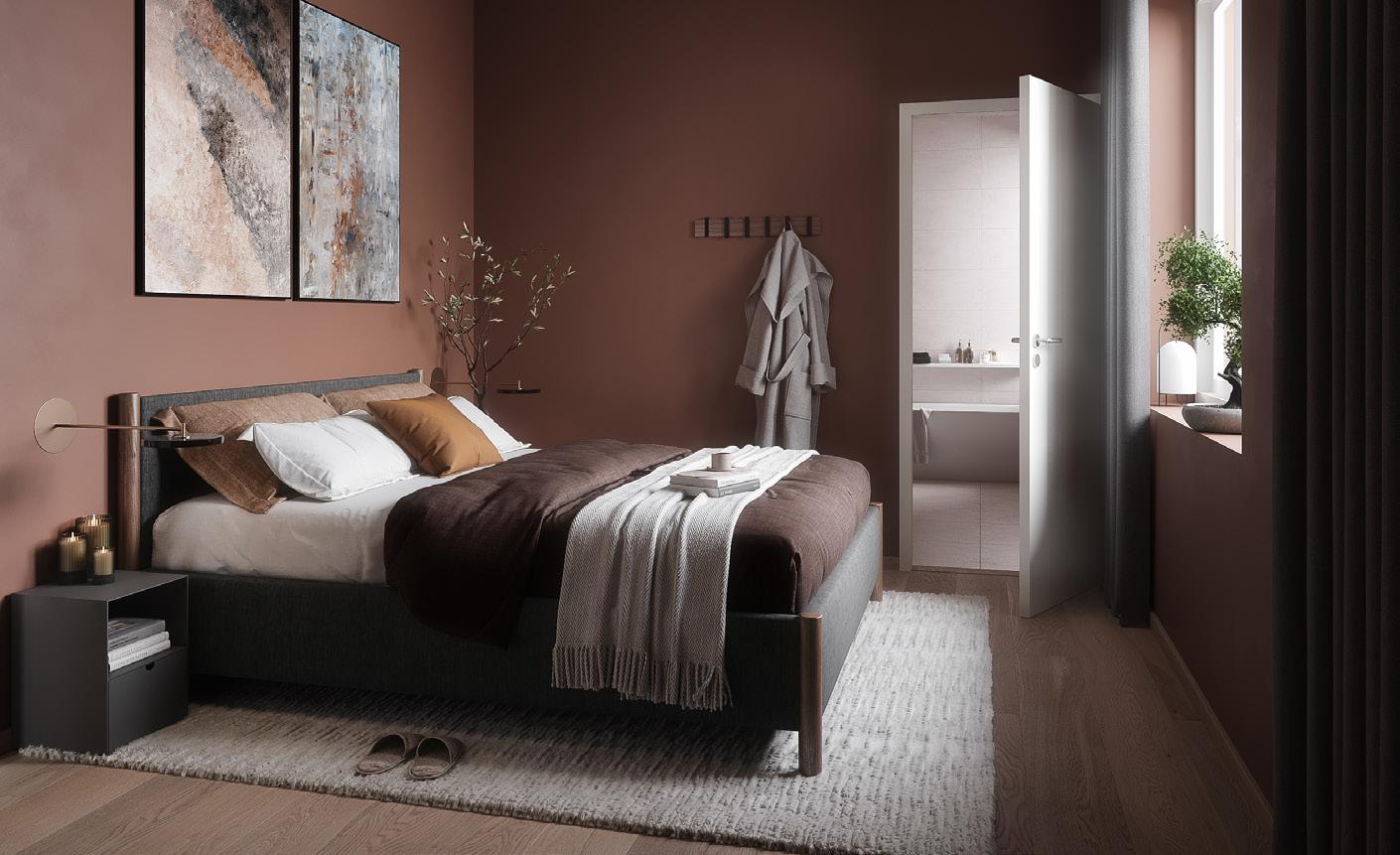 Leilighet B301 – samme planløsning for A301. Det stilrene soverommet med eget bad, gir deg en deilig privat sone i ditt eget hjem.